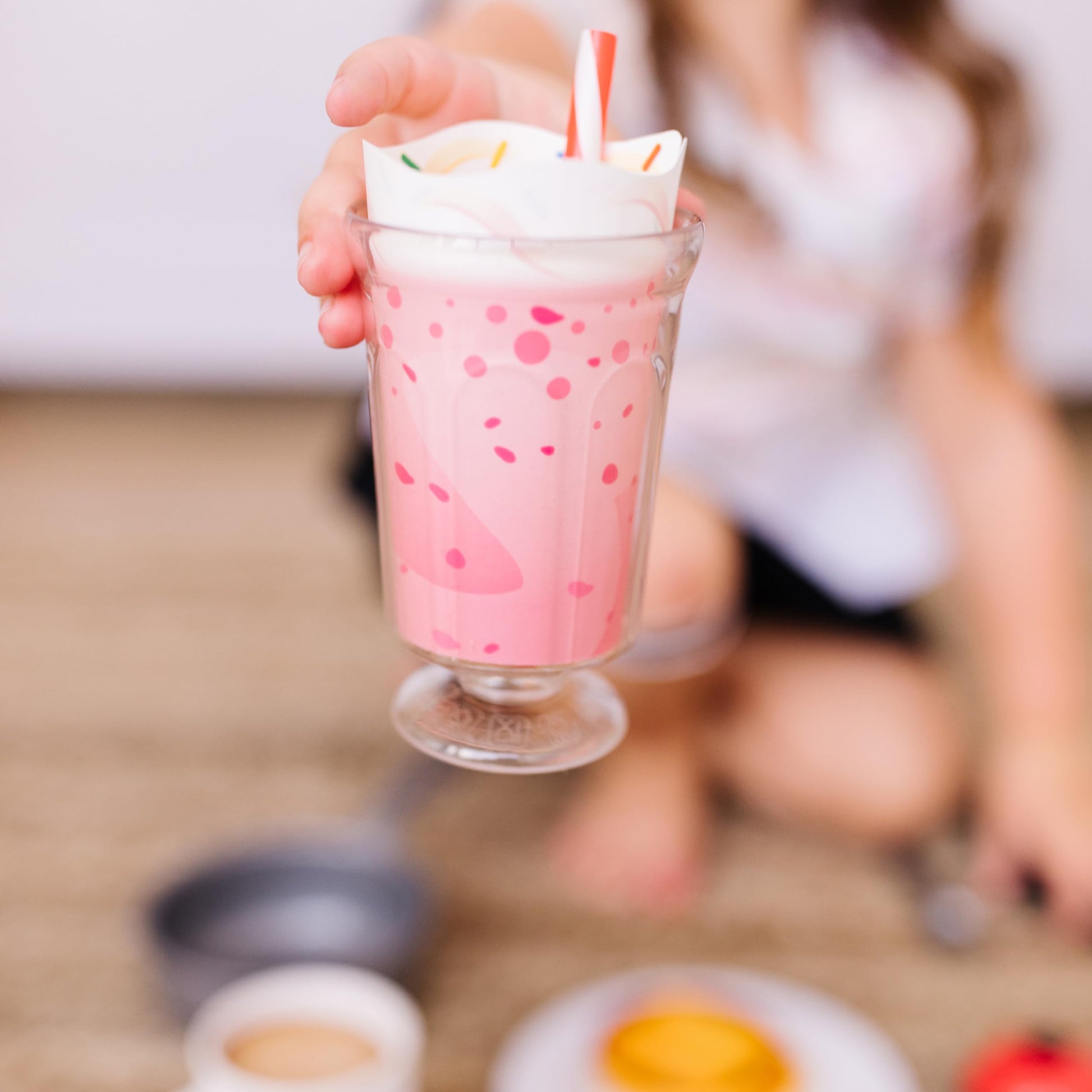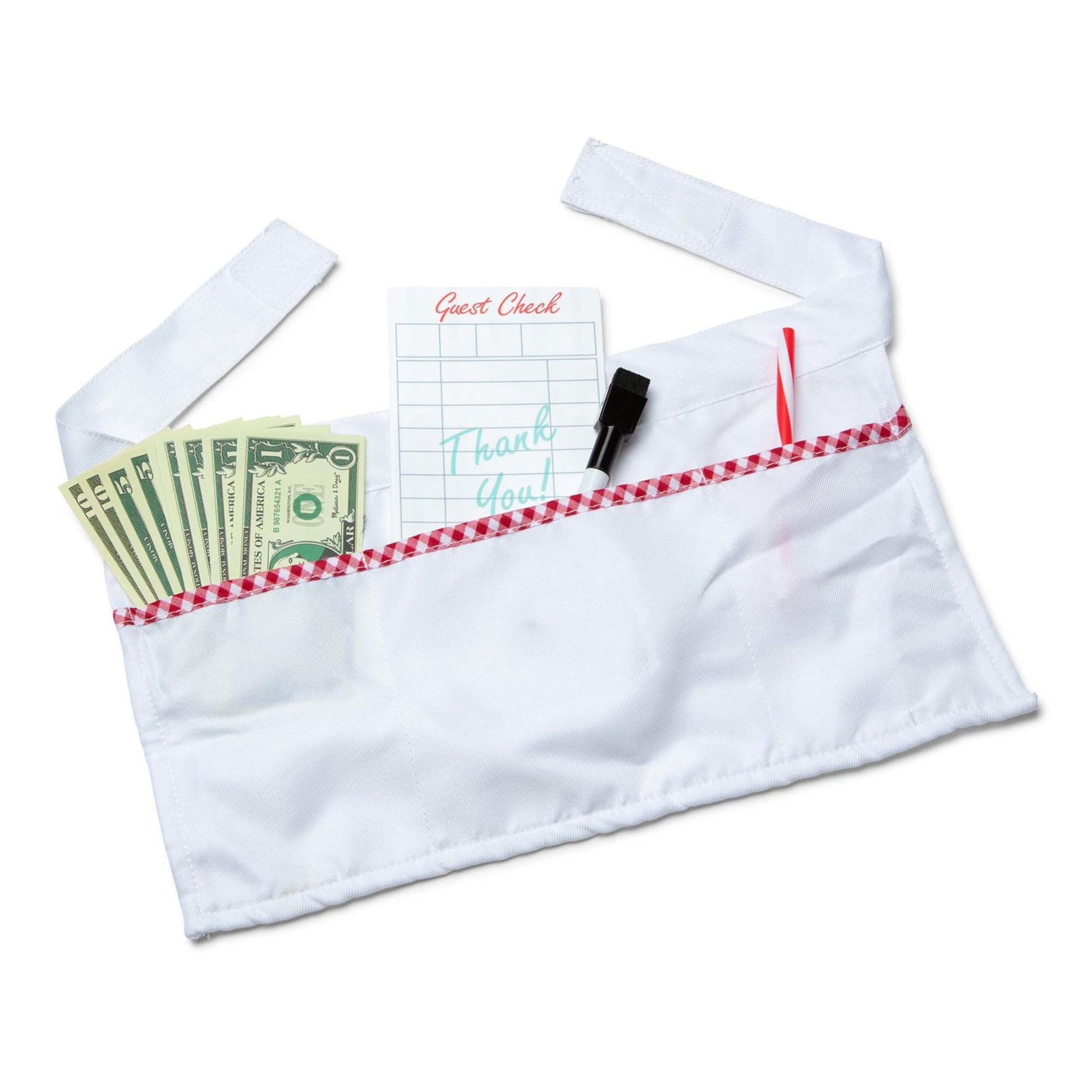 Order up! Everything kids need to serve up delicious diner classics is included in this 41-piece restaurant play set collection. Order on the reusable menu, cook with the durable plastic frying pan and spatula, and serve using a full place setting. Seven wooden food pieces have different food options on either side, and there are even double-sided milkshake and hot drink inserts. Servers and chefs can wear the apron and ring the bell when meals are ready, and customers can pay their bill (use the dry-erase marker on the guest check) with the included play money. Kids three and older hungry for imaginative play are sure to be satisfied!