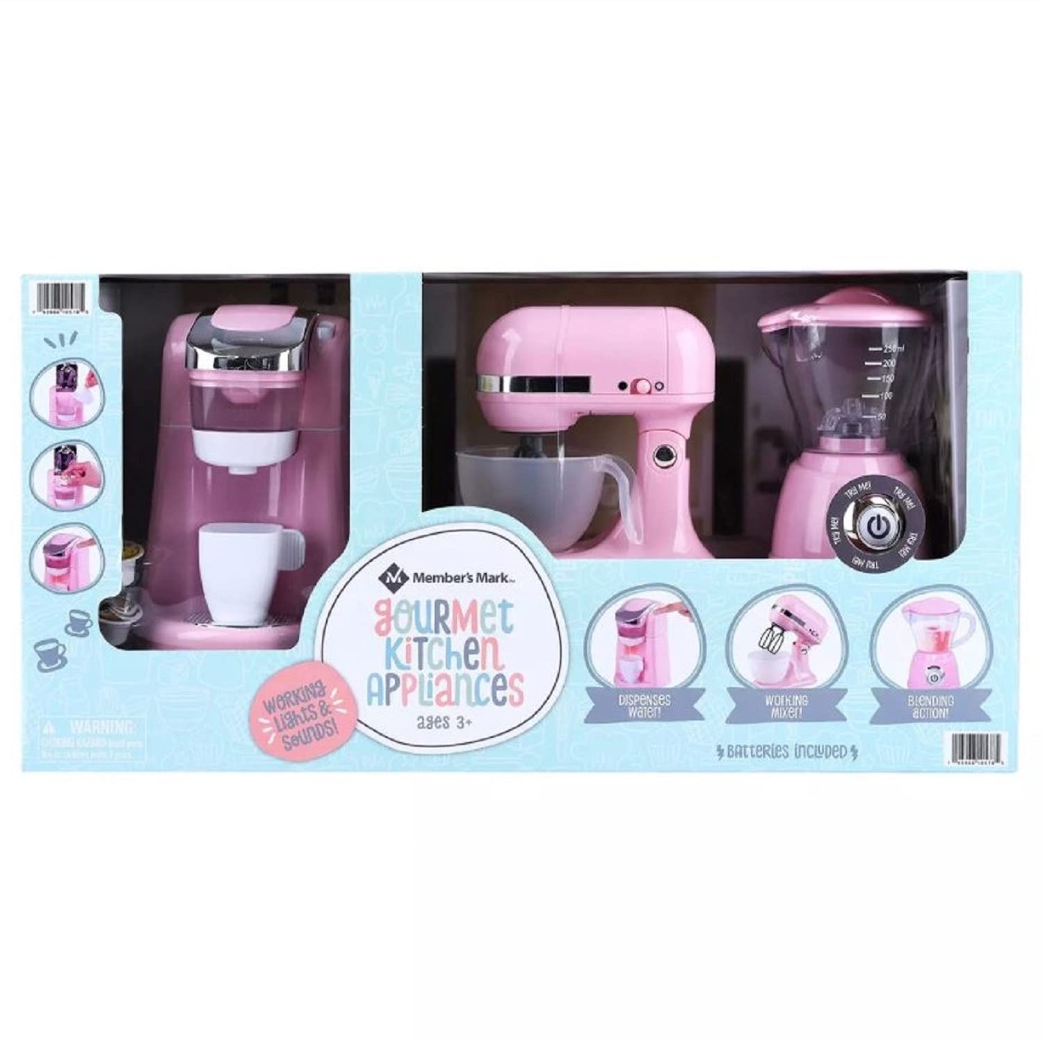 - Q: What materials are used in the Member's Mark Gourmet Kitchen Appliance Set? A: The set is crafted from durable, child-safe materials designed to withstand hours of imaginative play, though specific material details are not provided.