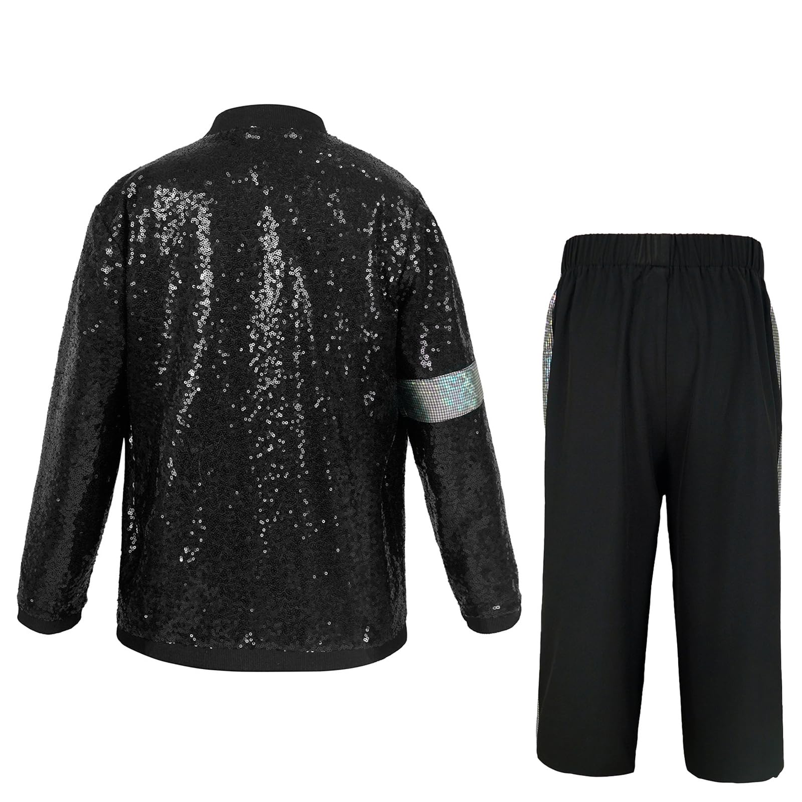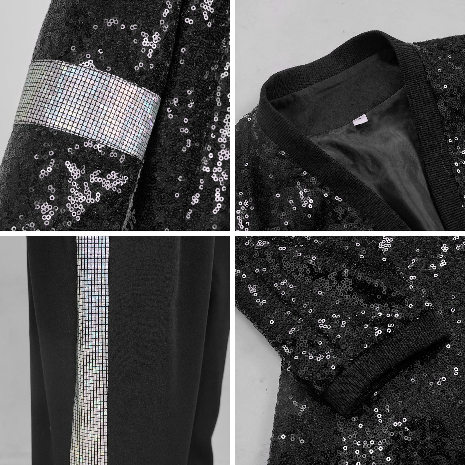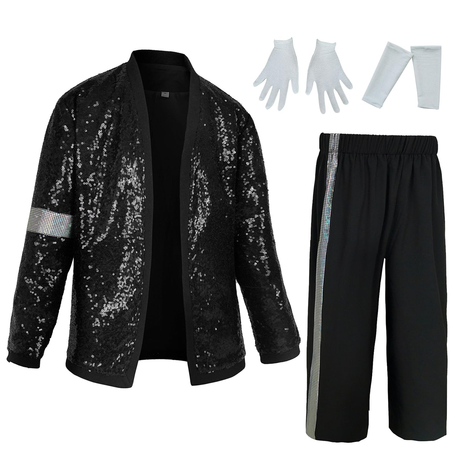 This boys disco costume includes a kids sequin jacket, a pair of silver striped bright pants, 2 gloves, and 2 socks, making it perfect for MJ character styling | Our kids dance star costumes are very versatile, it is one of Jackson most classic performance costumes and also suitable for 70s, 80s, and 90s dance star role playing | Our kids dance star costumes are very versatile, it is one of Jackson most classic performance costumes and also suitable for 70s, 80s, and 90s dance star role playing | Michael's songs are loved by many children and they are also fans of MJ, which will be a special birthday gift, Christmas or Halloween gift for children | Our kids jackets provide a loose fit, and the pants come with elastic bands for easy wearing. Please carefully read the size chart before purchasing