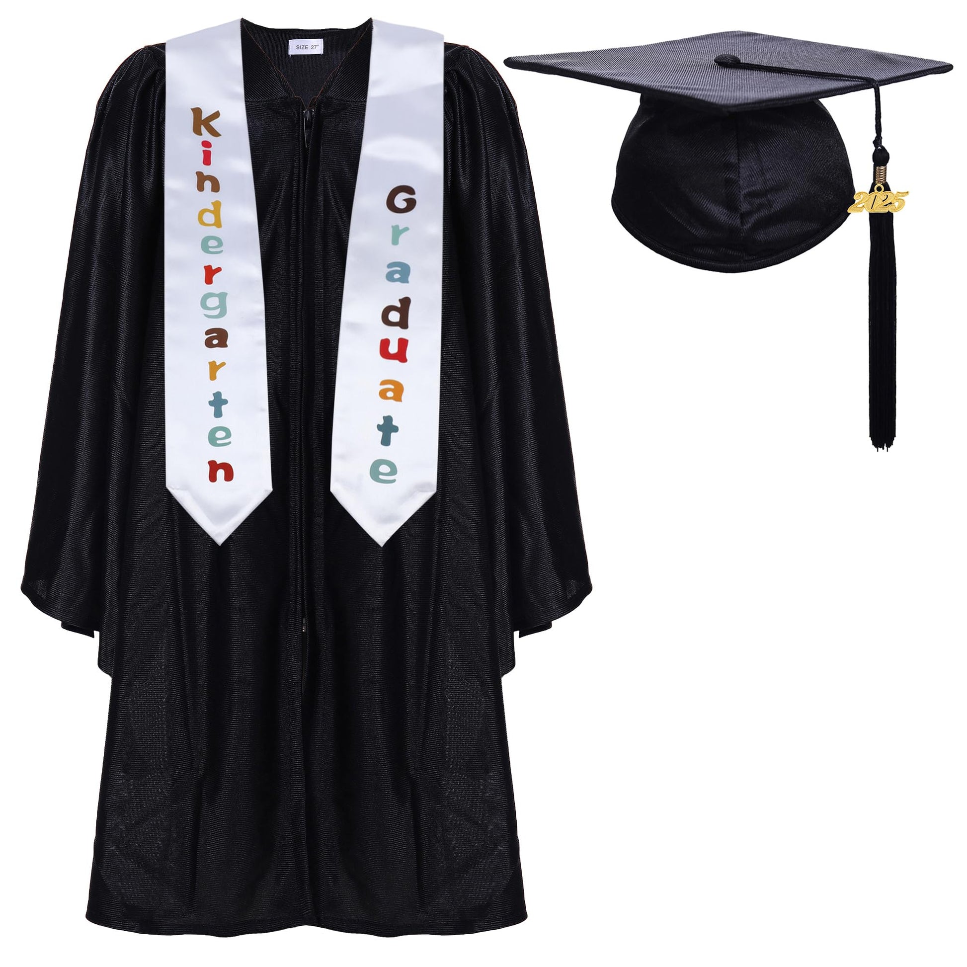 Newrara Kindergarten Graduation Cap and Gown Stole Package Excellent Quality Material: Thick and smooth shiny polyester. 11 Colors Avaliable: Black, Royal Blue, Navy, Purple, Red, Maroon, Gold, Green, White,Pink,Sky blue. 5 Sizes: Suitable for kids height ranges from 3'3'' to 4'5''. Perfectly fit for kindergarten and prek kids. Popular Style: Sturdy hidden color matching zipper in front, strong center pleats on the front and back shoulders of gown.