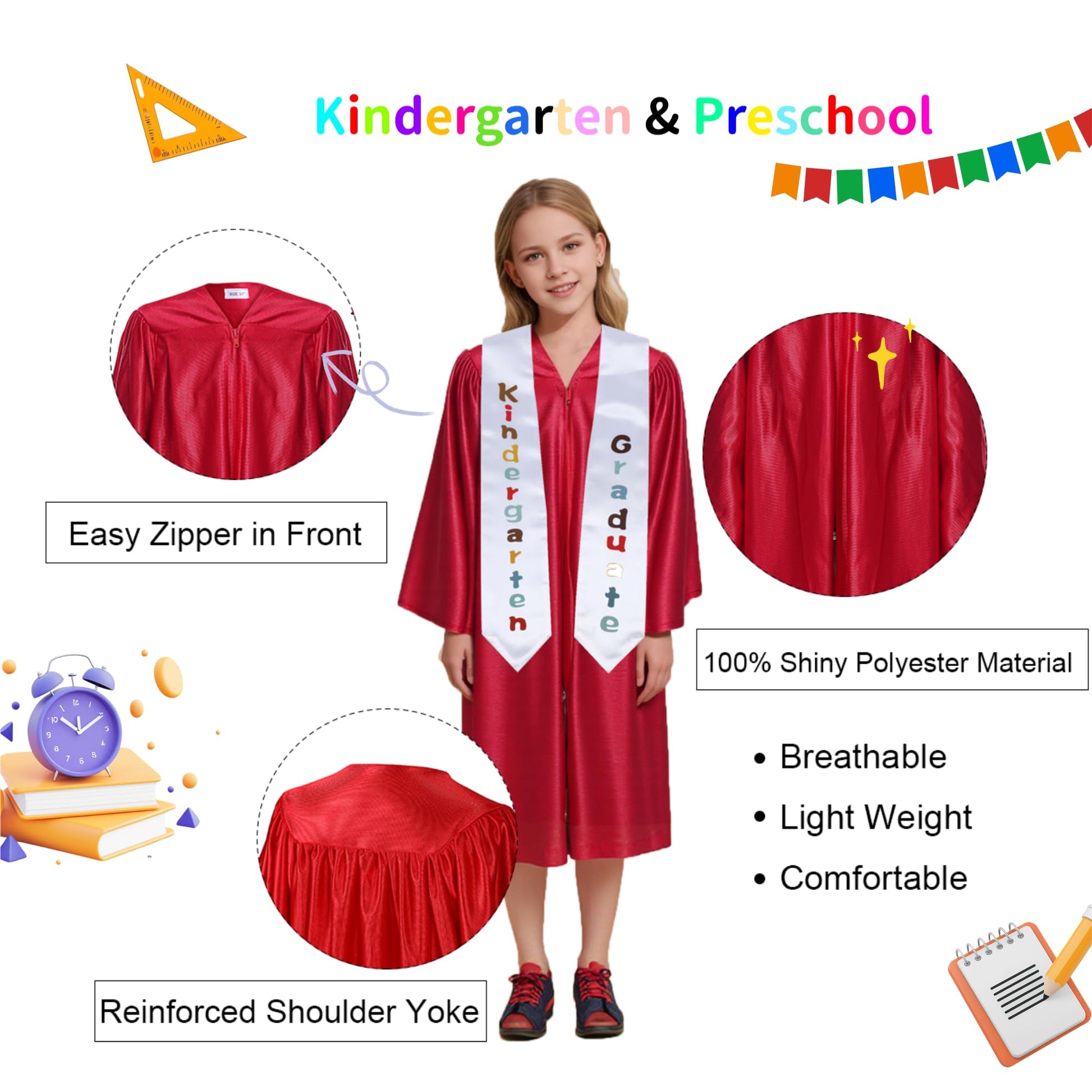 Newrara Kindergarten Graduation Cap and Gown Stole Package Excellent Quality Material: Thick and smooth shiny polyester. 11 Colors Avaliable: Black, Royal Blue, Navy, Purple, Red, Maroon, Gold, Green, White,Pink,Sky blue. 5 Sizes: Suitable for kids height ranges from 3'3'' to 4'5''. Perfectly fit for kindergarten and prek kids. Popular Style: Sturdy hidden color matching zipper in front, strong center pleats on the front and back shoulders of gown.