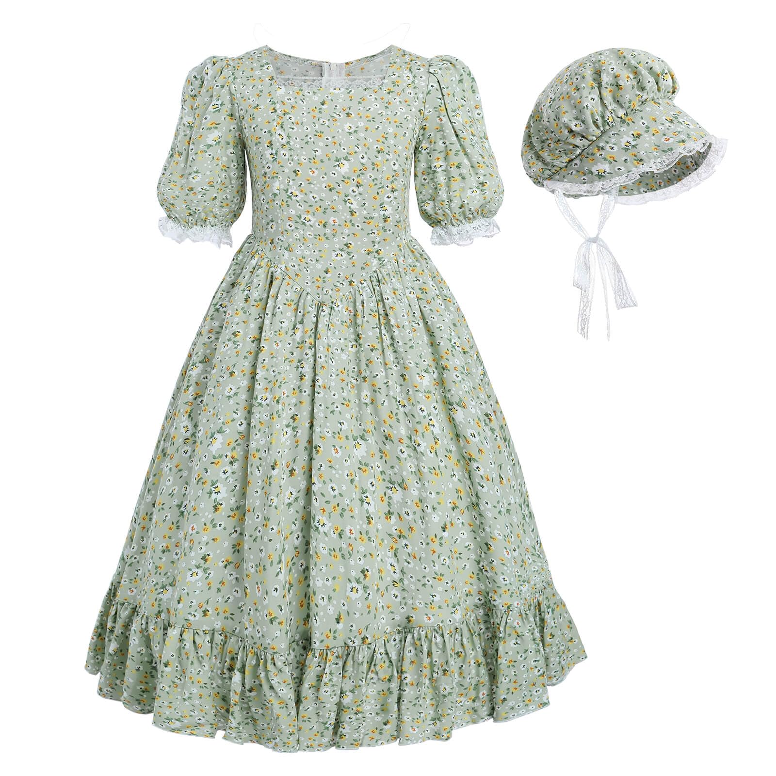Nuoqi Prairie Dresses for Girls, Girls Laura Ingalls Wilder Costume Pioneer Colonial Dress 6-7, Green