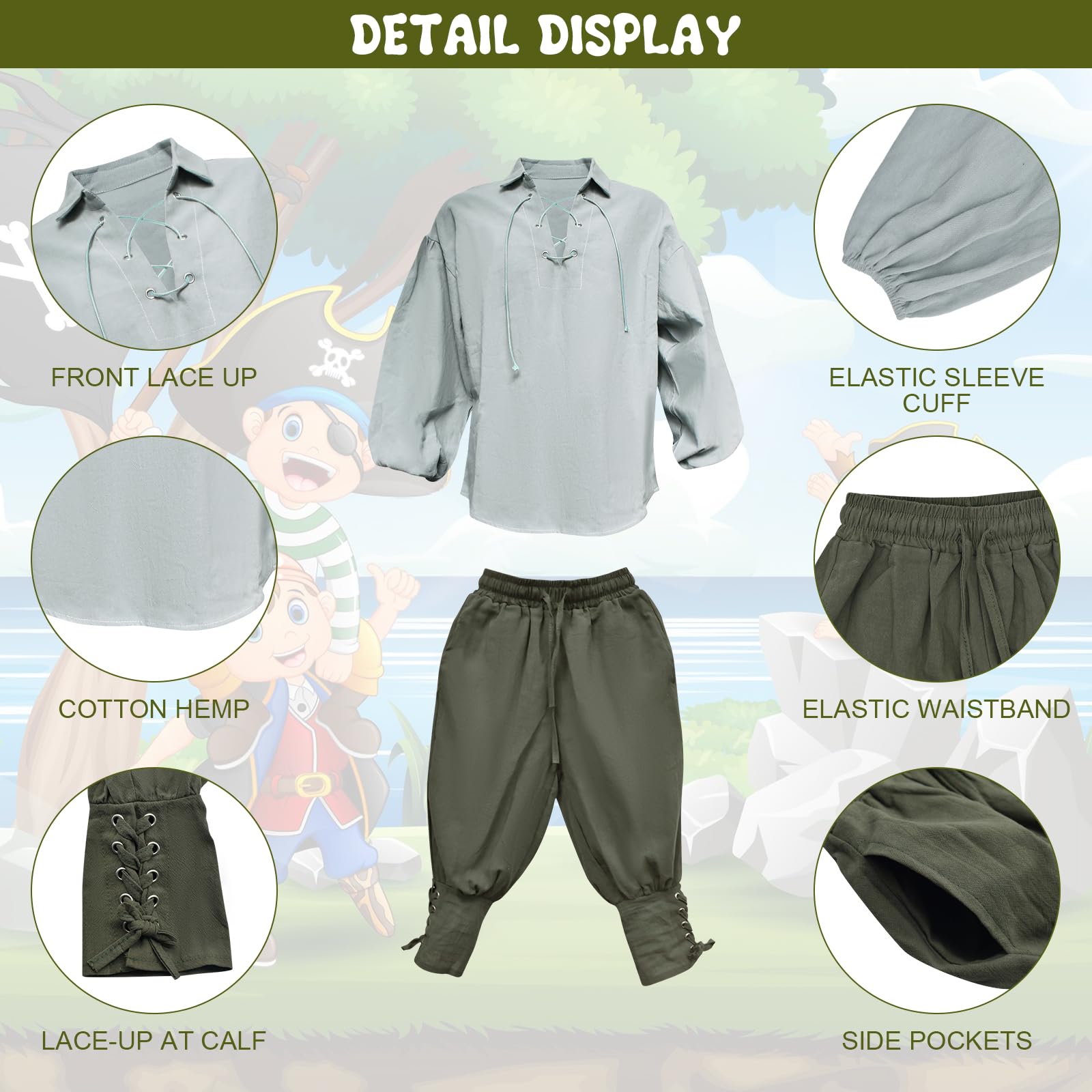 Prebene Boys Medieval Pirate Set Shirt & Ankle Pants Kids Renaissance Halloween Costume Scottish Jacobite Tops and Trousers (Gre