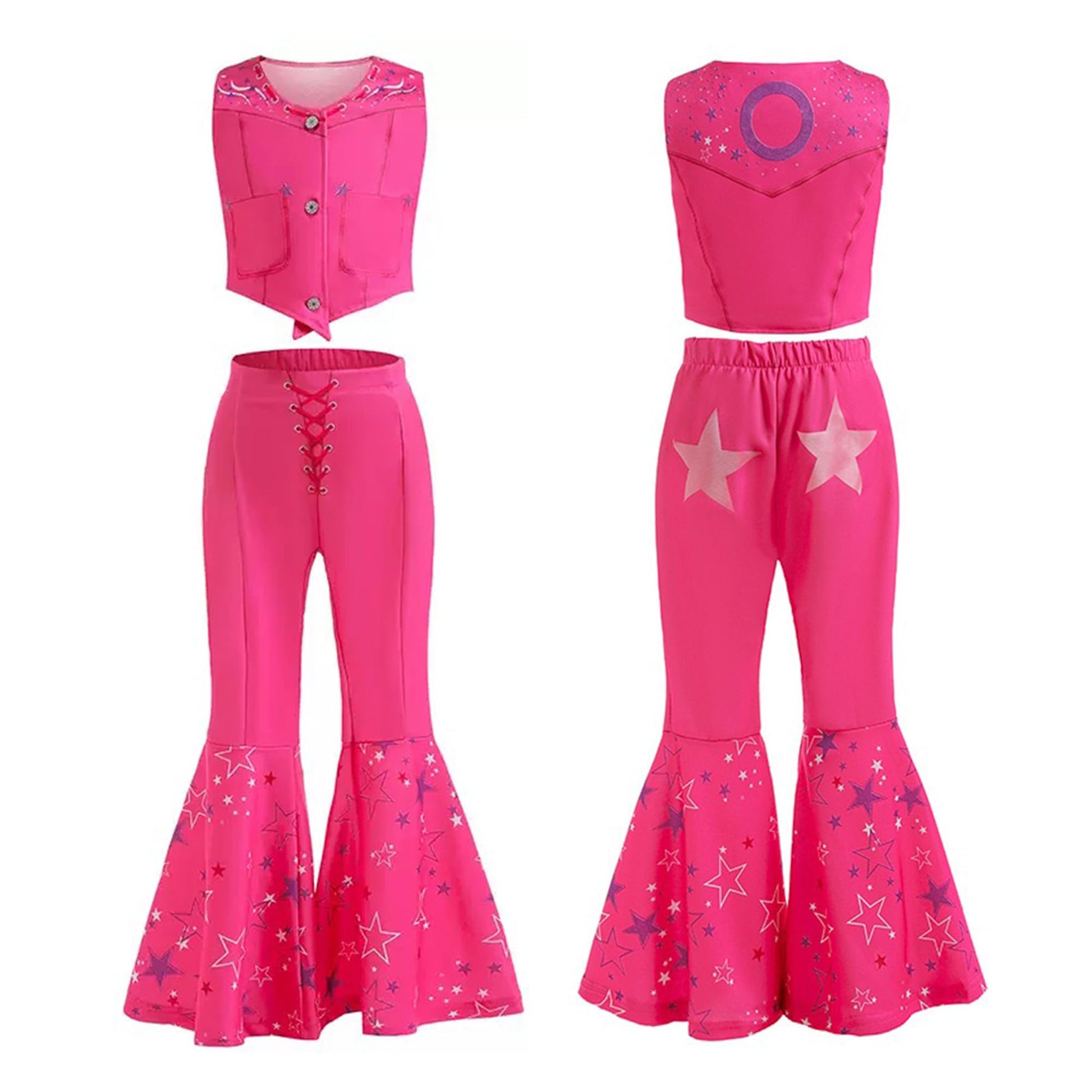 Saddle Up For Style and Adventure - This complete cowgirl costume has all your little cowpoke needs For stylish dress-Up play, from the charming rose vest and flared pants to the bandana and earrings that will make her feel like the belle of the wild west. | Imagine Yourself in the Wild West - Inspire your child's creativity and storytelling by letting their imagination run wild with this cowboy costume. The details will make them feel like the star of their own western tale. | Pretty as a Prairie Flower - With delicate details like floral prints, buttons, lace, and a touch of rose, this adorable cowgirl outfit will make your little one look as sweet as the prairie flowers. | Movie-Ready Chic for Cowgirl Cosplay - Fashioned after the popular 2023 doll movie, this cowgirl costume is perfect for themed parties and cosplay fun. Your girl will look like she stepped right out of the movie and into cowboy adventure. | Durable for Endless Days of Dress-Up Play - Crafted from quality materials designed to last through every imaginary adventure, this comfortable girls costume will let your cowpoke play dress-up for years to come.