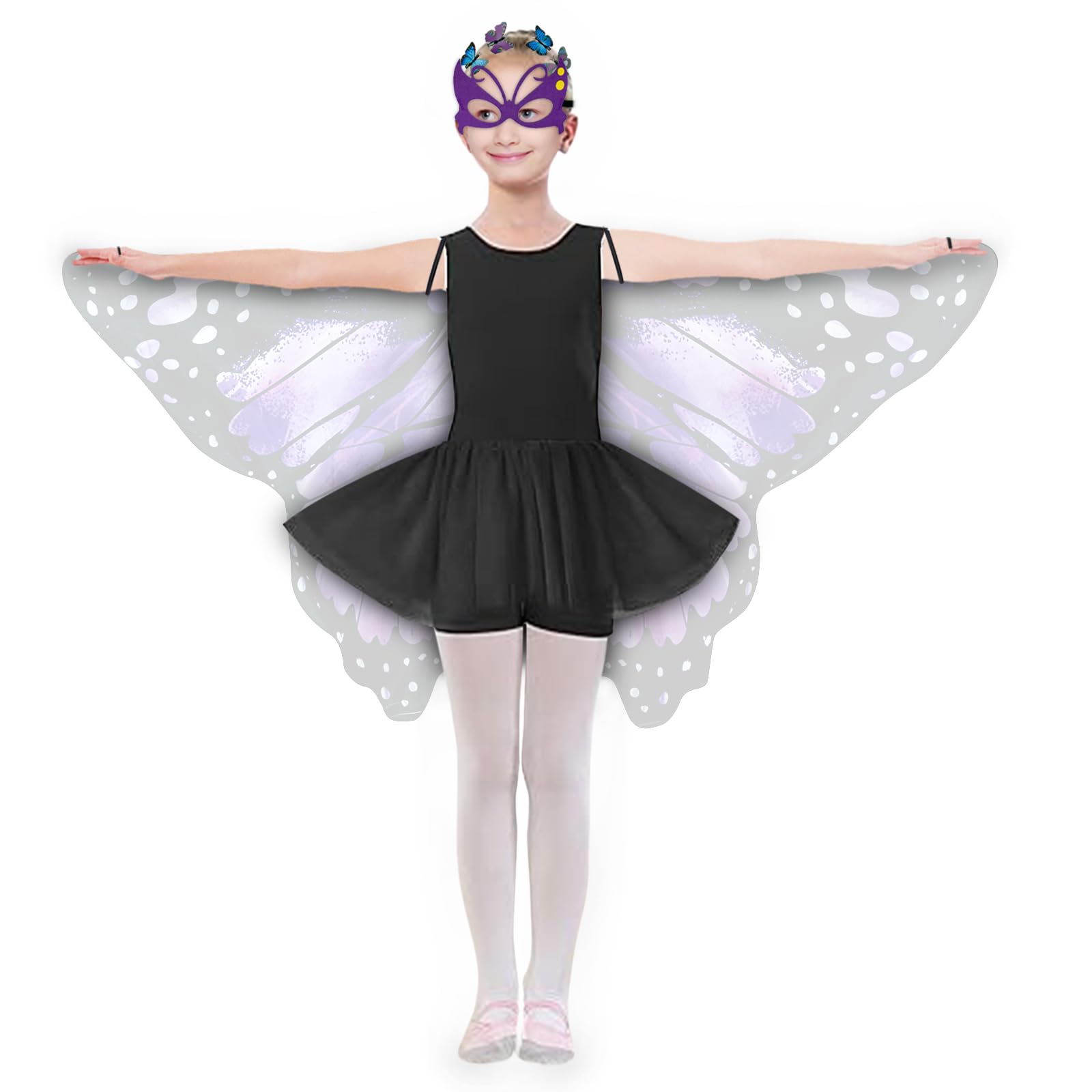 ?Fairy Butterfly Wings Sets?Fairy butterfly wings set for girls includes 1* Butterfly Wings+4* Butterfly Hair Clip Small+1* Colorful butterfly mask;Fairy Butterfly wings for girls: Lenght 65cm/25in Width 120cm/47in; Available in Orange, Pink, Purple, Iridescent, Blue Pink, Powder Blue, and Star Blue.Suitable for 4-9 years old girls, erfect for butterfly party favors gifts. | ?Unique Design?24 years newest butterfly costume kids set consists of butterfly wings and Butterfly Hair Clip Small in the set features; crafted from soft wearable comfortable and breathable fabrics; When perfectly matched with the colorful face mask in the set accessories, it will surely be loved by your kids and become the coolest and brightest focal point in parties and role plays. | ?Safety and Convenience?Fairy Butterfly Wings Set are made of safe materials; The elastic band of the butterfly wings can be easily and comfortably put on the shoulders to fix the clothes on the body, the fingers can put on the end of the elastic band clasp ; and when used together wave your arms, it is just like a butterfly fluttering among the flowers. | ?Easy To Wear Take off Store?:This butterfly costumes is lightweight, takes up little space and fits easily in your bag. Thanks to the elastic band and finger loops, the butterfly wings are easy to put on and take off. Just attach the elastic band, then wrap the loops around your fingers and gently wave your arms, the soft butterfly cape will fly up like butterfly wings, making you look like a beautiful butterfly fairy. You can swing freely like a butterfly for an immersive effect. | ?Applicable Occasion?: butterfly wings costume set, perfect for girls fairy dress-up, garden playtime, Halloween, animal-themed birthday party, Toddler dress up, just everyday whimsical pretend play, dancing costumes, role play, school performances, play dates or party return gifts. It can also be used as a unique gift for friends, family, coworkers.
