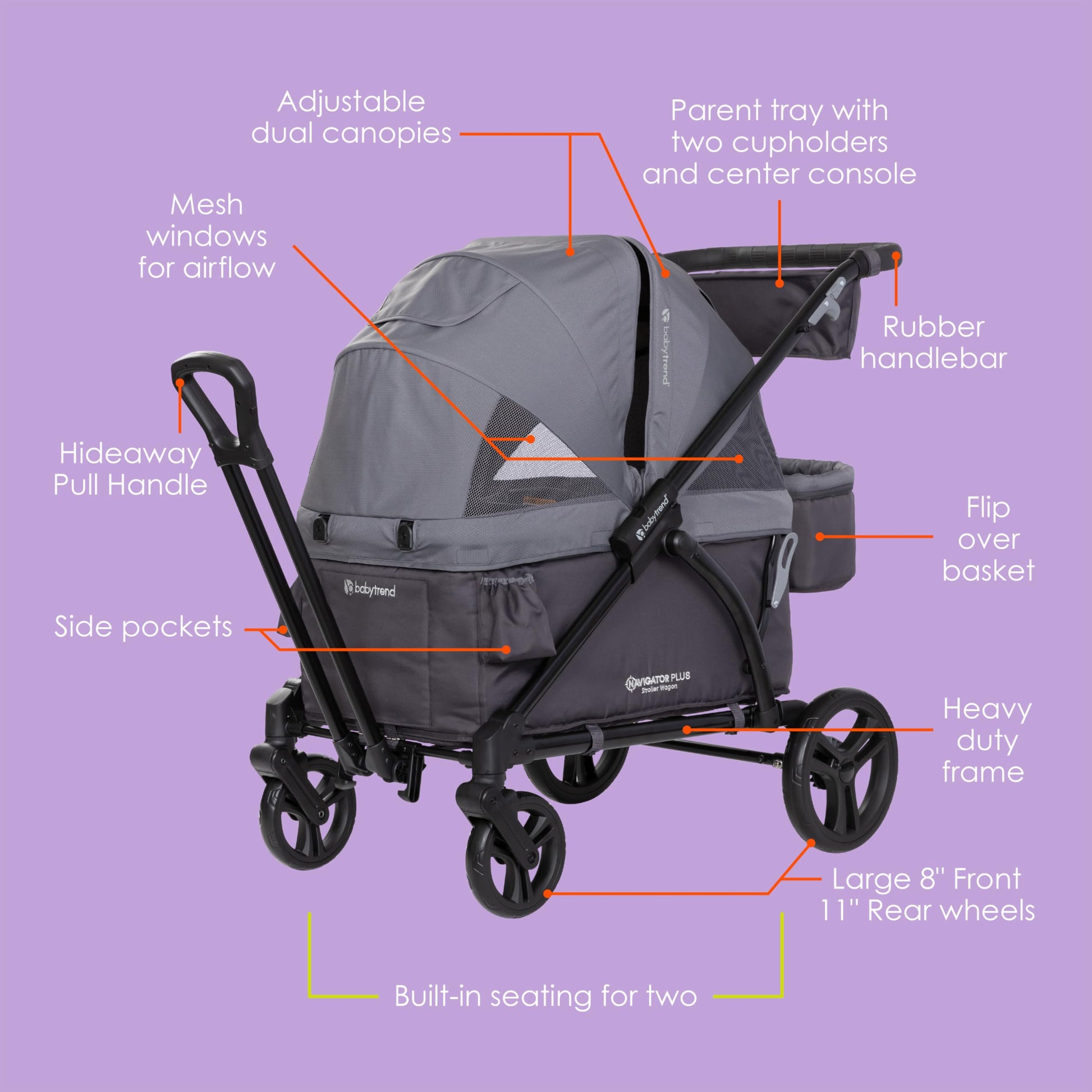 The Navigator Plus 2-In-1 Stroller Wagon Is The New And Improved Wagon Option From Baby Trend To Fit Your Family'S Unique Needs! The Large Cargo Space Offers Built-In Seating For Two And Includes Two 3-Point Safety Harness Belts To Keep Your Little Ones Secure. The Dual Canopies Are Independent And Will Shield Both Children From Environmental Stressors, Such As The Sun. Both Canopies Are Adjustable And Can Be Easily Removed When Not In Use. The Durable Frame Is Dependable And Will Be A Trusted Addition To All Family Outings. The Wagon'S Hide-Away Pull Handle Is Adjustable And Offers A Pull Wagon Option. The Stroller Handle Can Be Used When In Push Stroller Mode. The Stroller Handle Also Includes A Parent Tray With Two Cupholders And A Center Console For Added Storage. The Child Tray Allows You To Easily Keep Snacks Close By With Two Cup Holders And Center Consoles For Each Child. The 8' Front And 11' Rear Wheels Provides A Smooth Ride For Your Family Whether Spending Time Indoors Our Outside! A Flip Over Basket Can Easily Be Attached To The Front Or Rear Of The Wagon, Adding Even More Storage Capabilities. Little Ones Will Enjoy The Extra Support With The Versatile Seat2Mat. This Stroller Wagon Can Hold Up To 110 Lb And Is Ideal For Babies Who Can Sit Up Unassisted, Toddlers And Young Children.