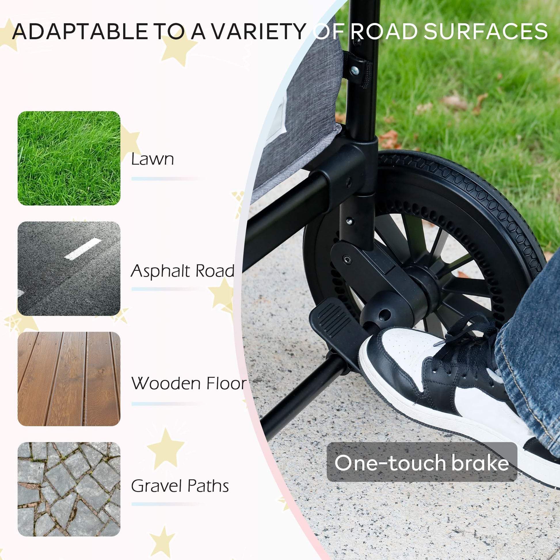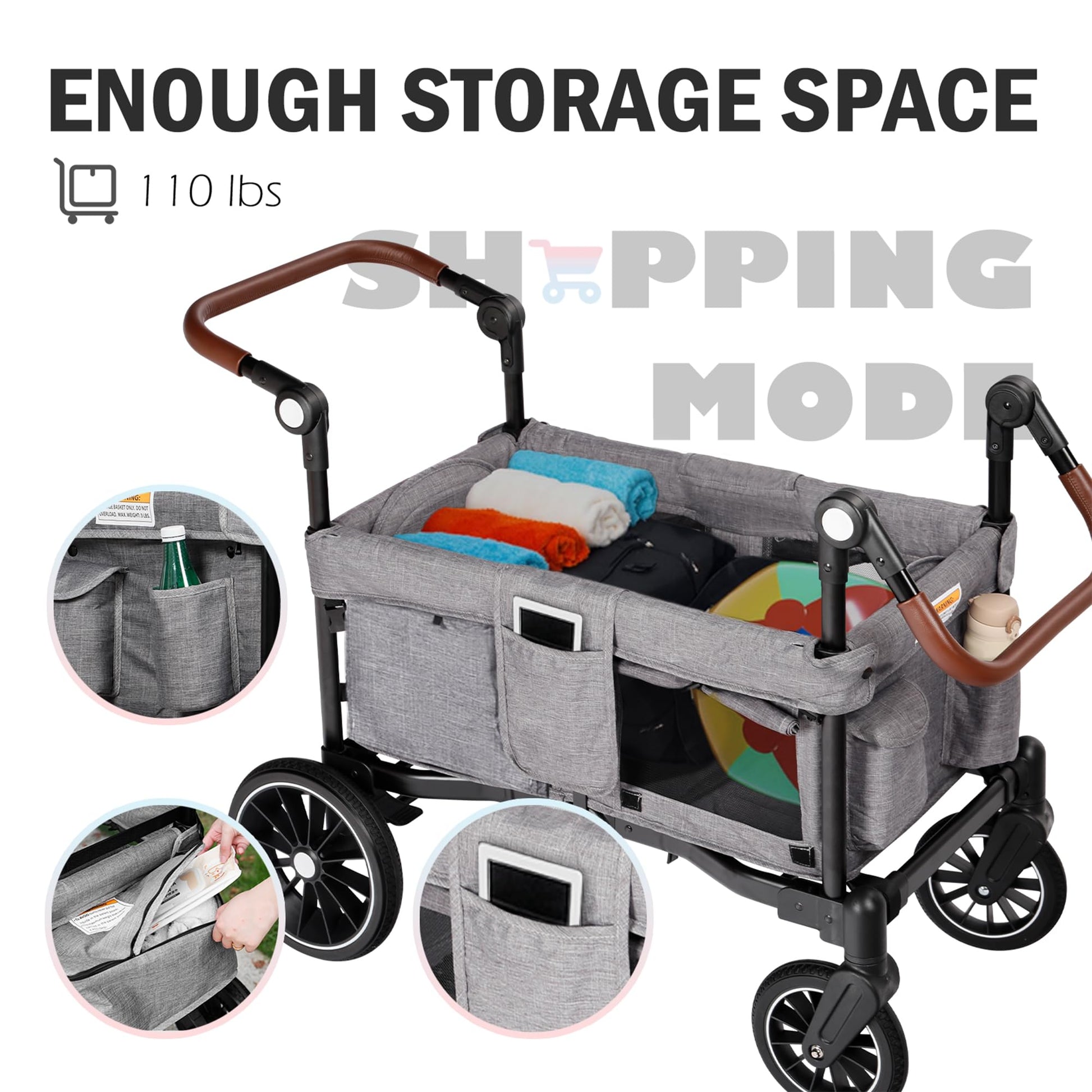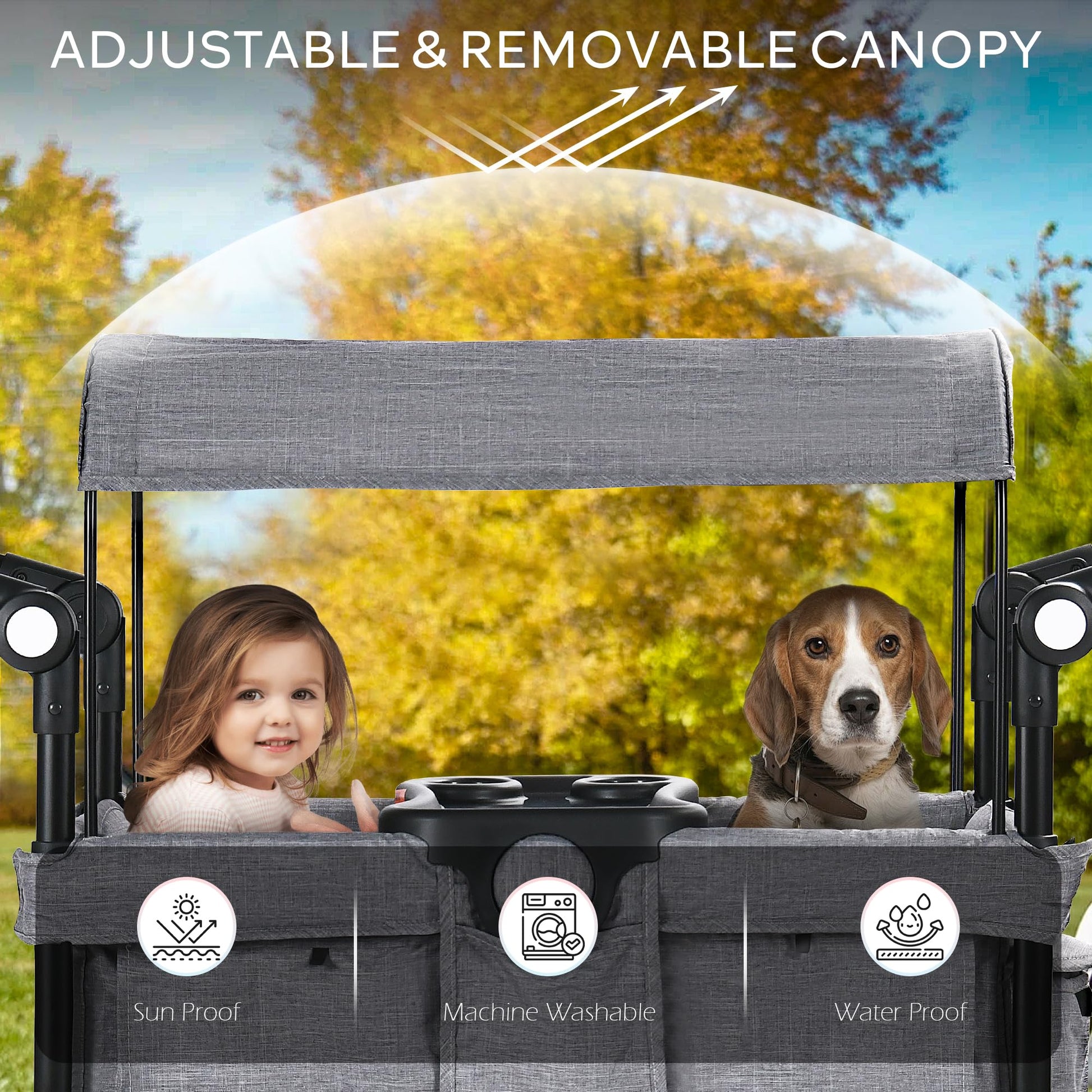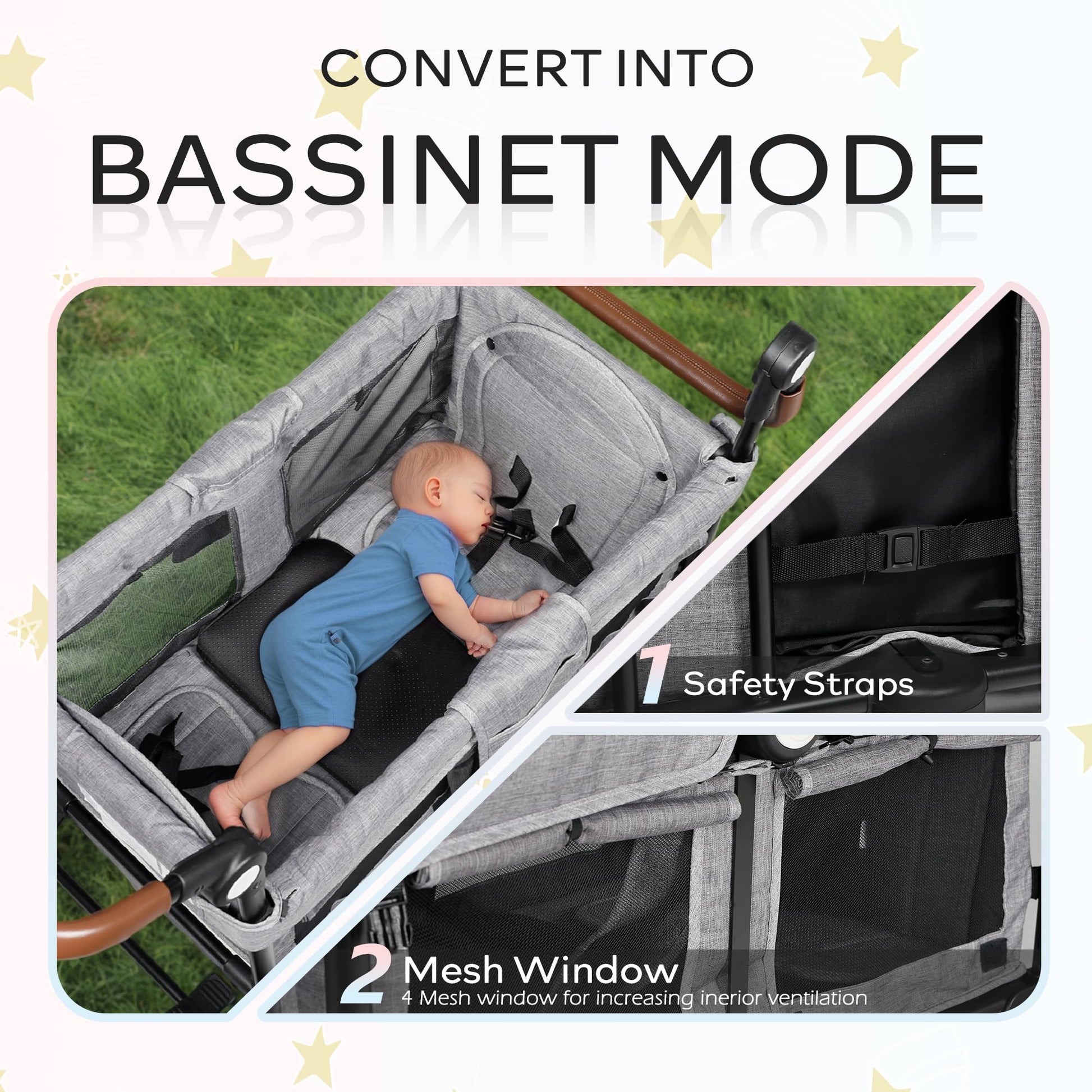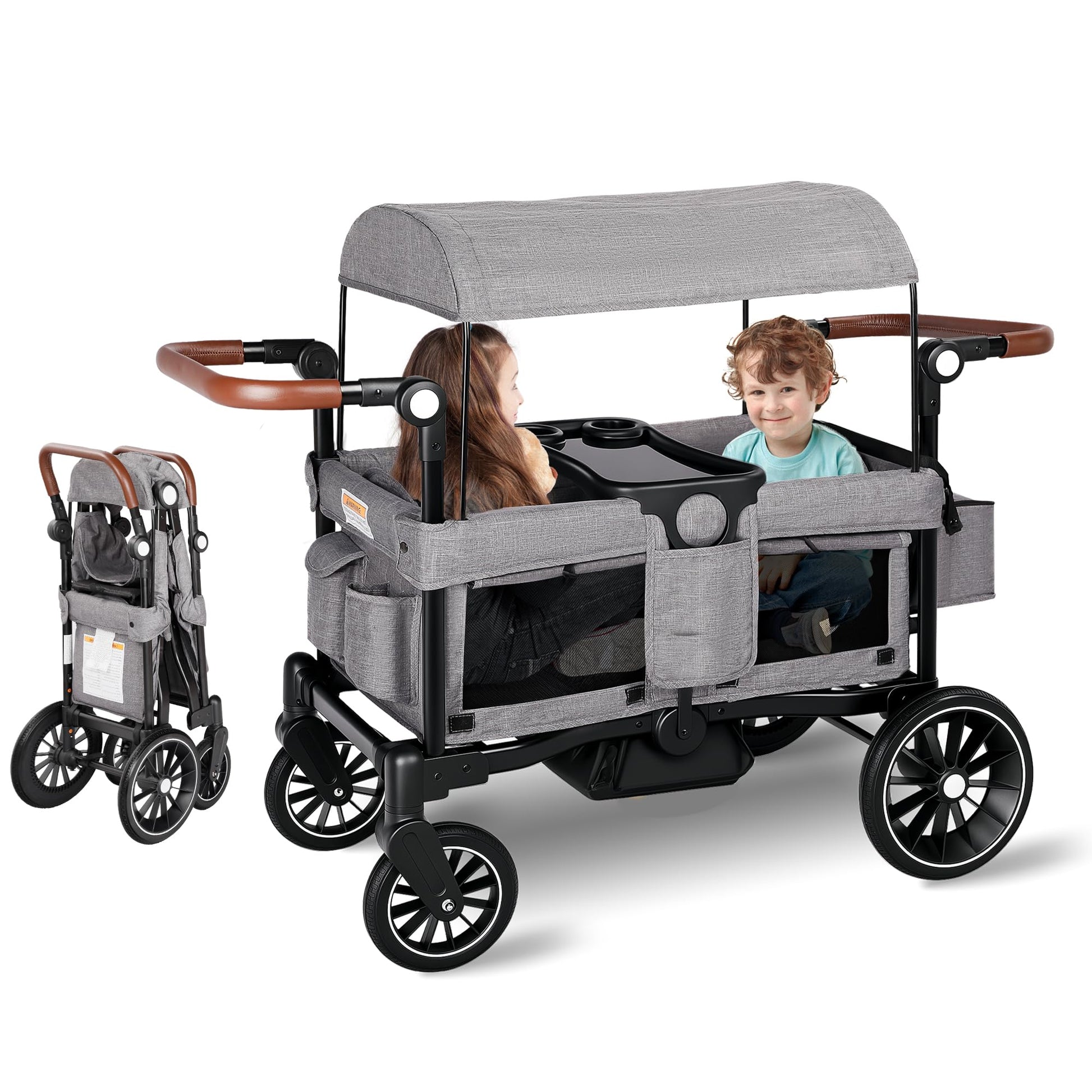 Kinder King Folding Wagon Stroller for 2 Kids, Stroller Wagon w/Removable Canopy, Convert to Newborn Bassinet, Adjustable Handle, All-Terrain Shock-Absorbing Wheel, Detachable Tray, Diaper Bag, Grey