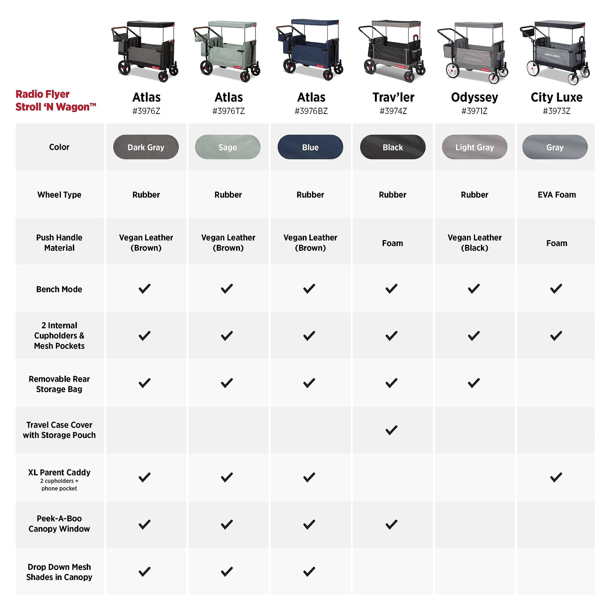The new Atlas Stroll 'N Wagon™ is the perfect addition to unforgettable family adventures. This versatile wagon offers push and pull steering and 3 different modes: riding, hauling, and bench mode. The adjustable push bar features a premium vegan leather grip and the Never Fall™ pull handle stays upright when not in use. There is no shortage of storage with the XL parent caddy, internal storage pockets, front mesh pocket and removable rear storage bag. The parent caddy features 2 insulated cupholders, zippered pocket, and a center compartment with magnetic lid while the rear storage bag doubles as a convenient tote bag with handles when removed from the wagon. The UV protection canopy has a peek-a-boo window and drop-down mesh shades on either side. The rear foot brake provides an extra layer of safety and stability. The quick-adjust 5-point safety harnesses and quilted seatbacks provide maximum comfort and security for riders as young as 12 months. Crafted with Duraclean® 2.0 fabric, our highest quality fabric, this wagon is stylish and easily wiped clean. The Atlas Stroll 'N Wagon™ is the perfect choice for luxury, functionality, and comfort. Maximum weight capacity 120 lbs. Recommended for ages 1+. For additional questions, support, or concerns, please contact our customer service team at https://www.radioflyer.com/customer-service/ or 1 (800) 621-7613.