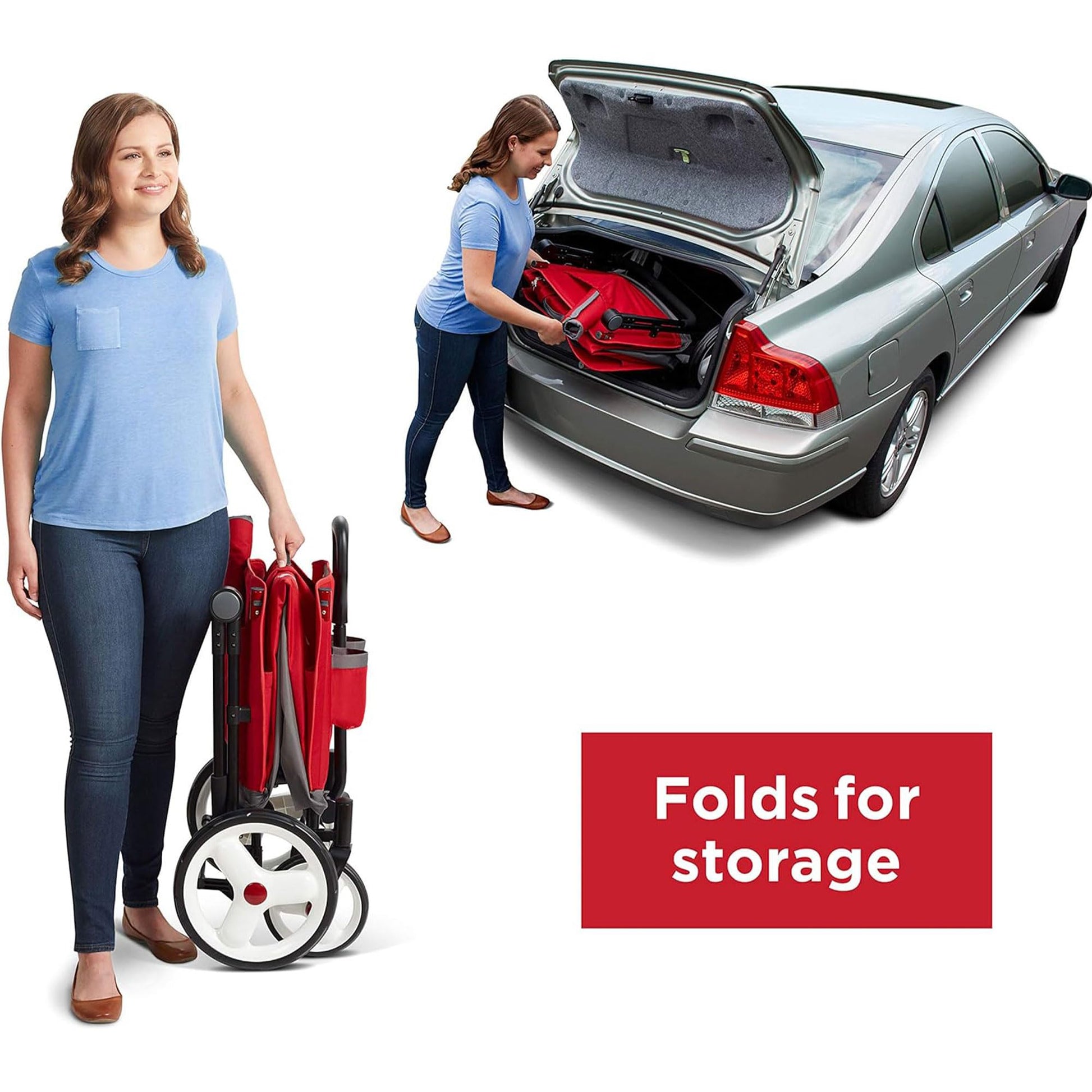 Smooth Ride Design: Equipped with front caster wheels and large 12-inch rear wheels, the Radio Flyer Convertible Stroll 'N Wagon provides exceptional maneuverability and a smooth ride on various terrains. Whether navigating city streets or park paths, this wagon handles it all with ease.