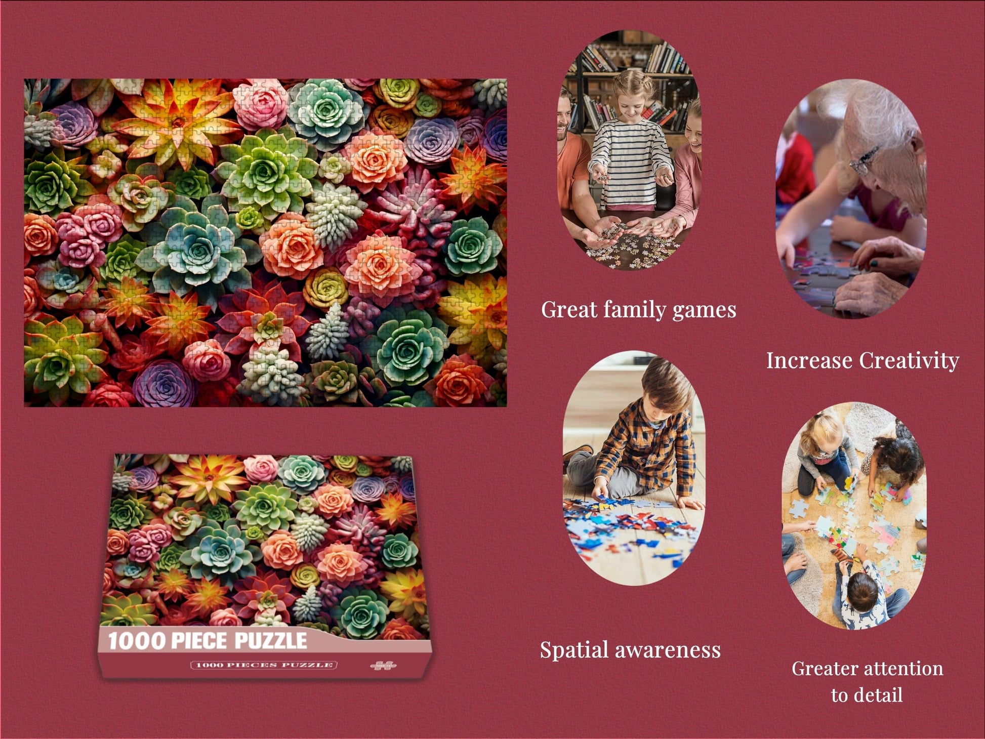 - Q: Is this puzzle suitable for both children and adults? A: Absolutely! With 1000 pieces, the WANGMHCY succulent puzzle presents a fun challenge suitable for both children and adults, making it a great family activity.