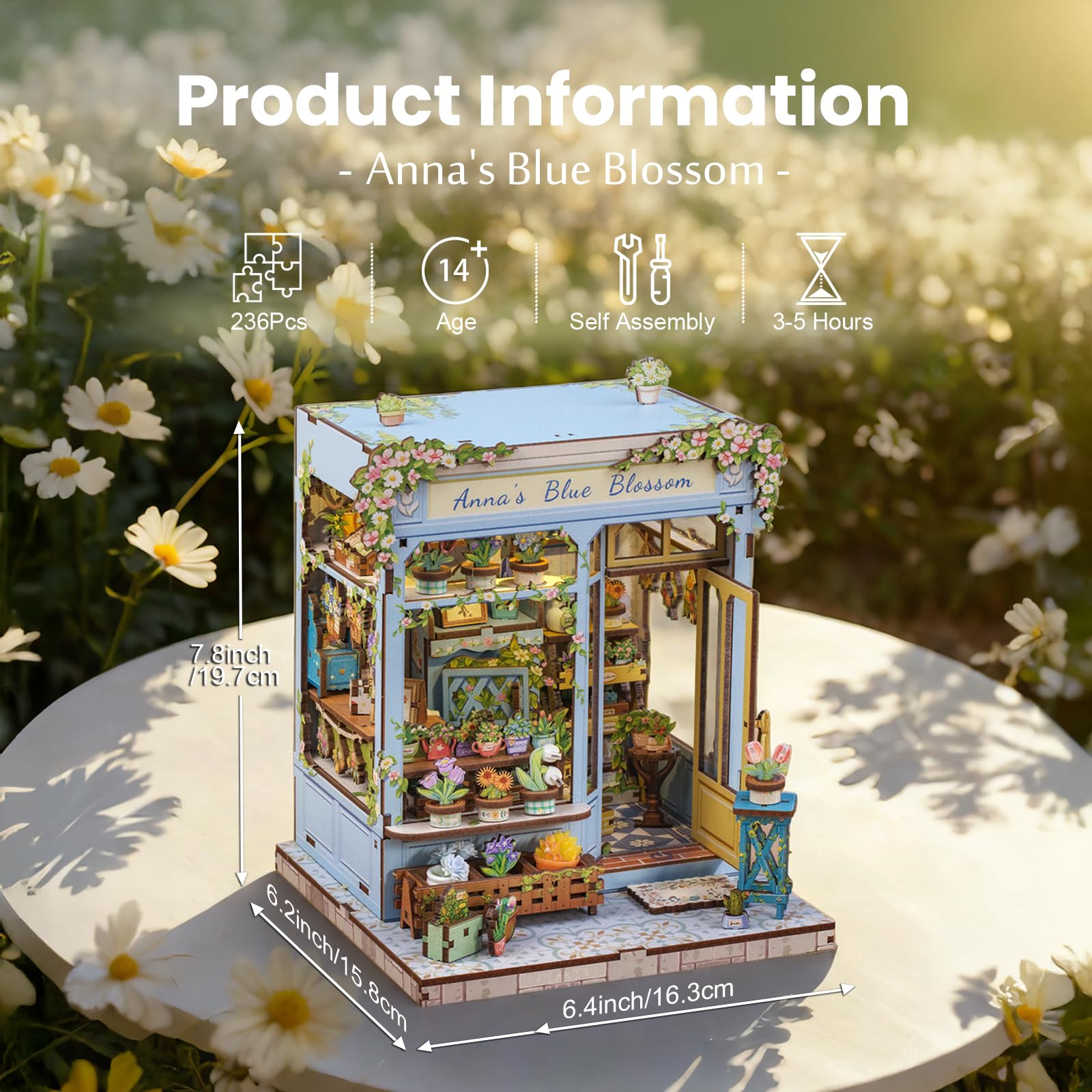 Fsolis Book Nook Kit - DIY Scene Miniature Dollhouse Kit for mature-themeds Bookshelf 3D Puzzles 255PCS Tiny House Mini Flower Shop Model Booknook Craft Gifts for Women Puzzle Lovers (Anna 's Blue Blossom)