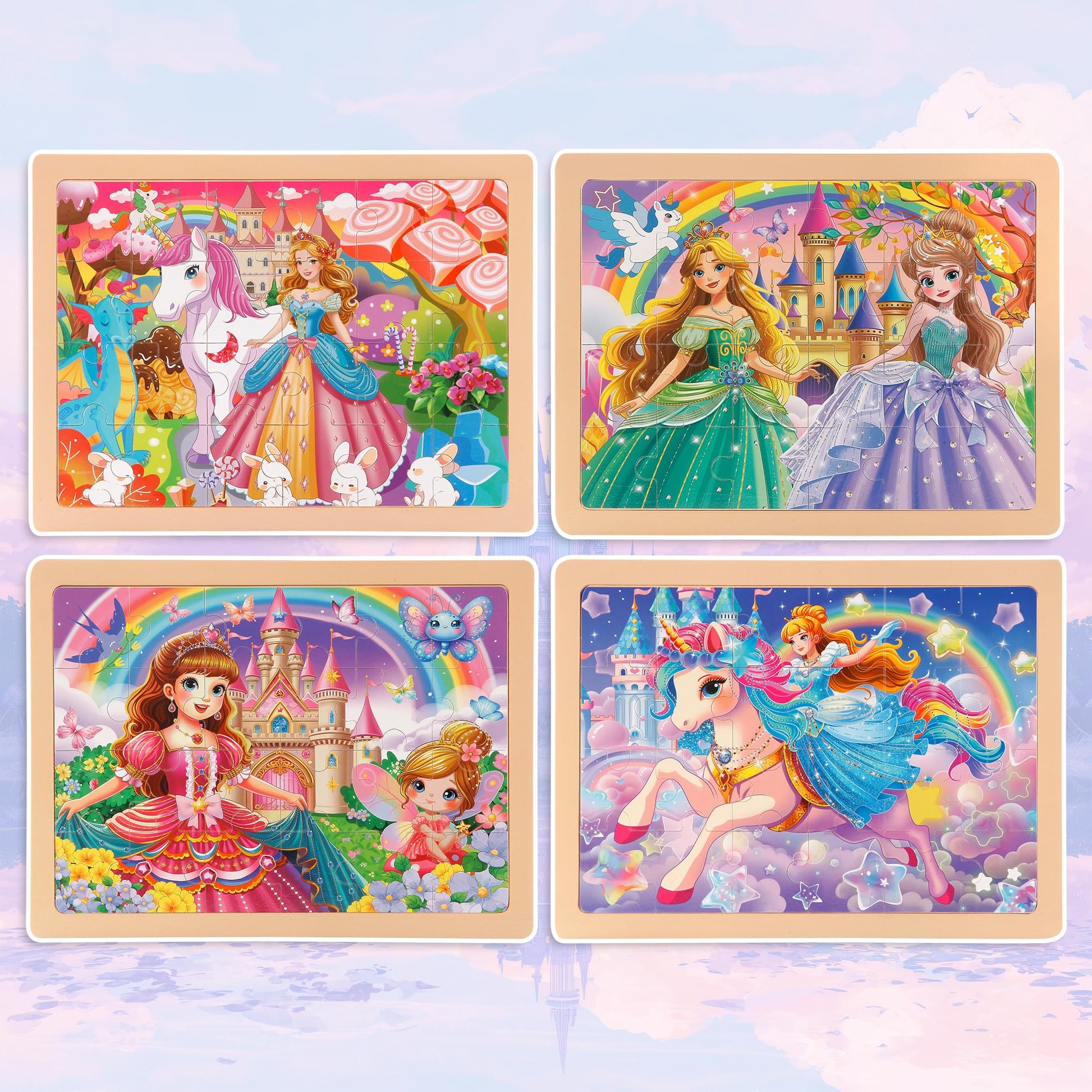 enhanced Quality & Safe for Kids: Made from well-made extra-thick wood with smooth polished edges ensuring a safe and comfortable grip for little hands. Non-toxic and child-friendly materials provide worry-free play. | Large Size: Each of puzzle size is: 11.8x8.85 inches. The wooden puzzles are designed with removable paper illustrations underneath that children can use as a reference. | Safe & Durable Wooden Materials: Made of well-made and thick wood material the edges of each piece are carefully polished so that the child can grasp it safely good tactile feeling. | Educational and Fun: Spark imagination and boost cognitive development! These puzzles help improve hand-eye coordination spatial reasoning and critical thinking while keeping kids engaged in creative play. | Complete Gift-Ready Set: Each themed gift box contains 4 beautifully illustrated puzzles (24 pieces each) with a wooden frame to hold pieces in place. Perfect for birthdays holidays or as an enriching learning activity.