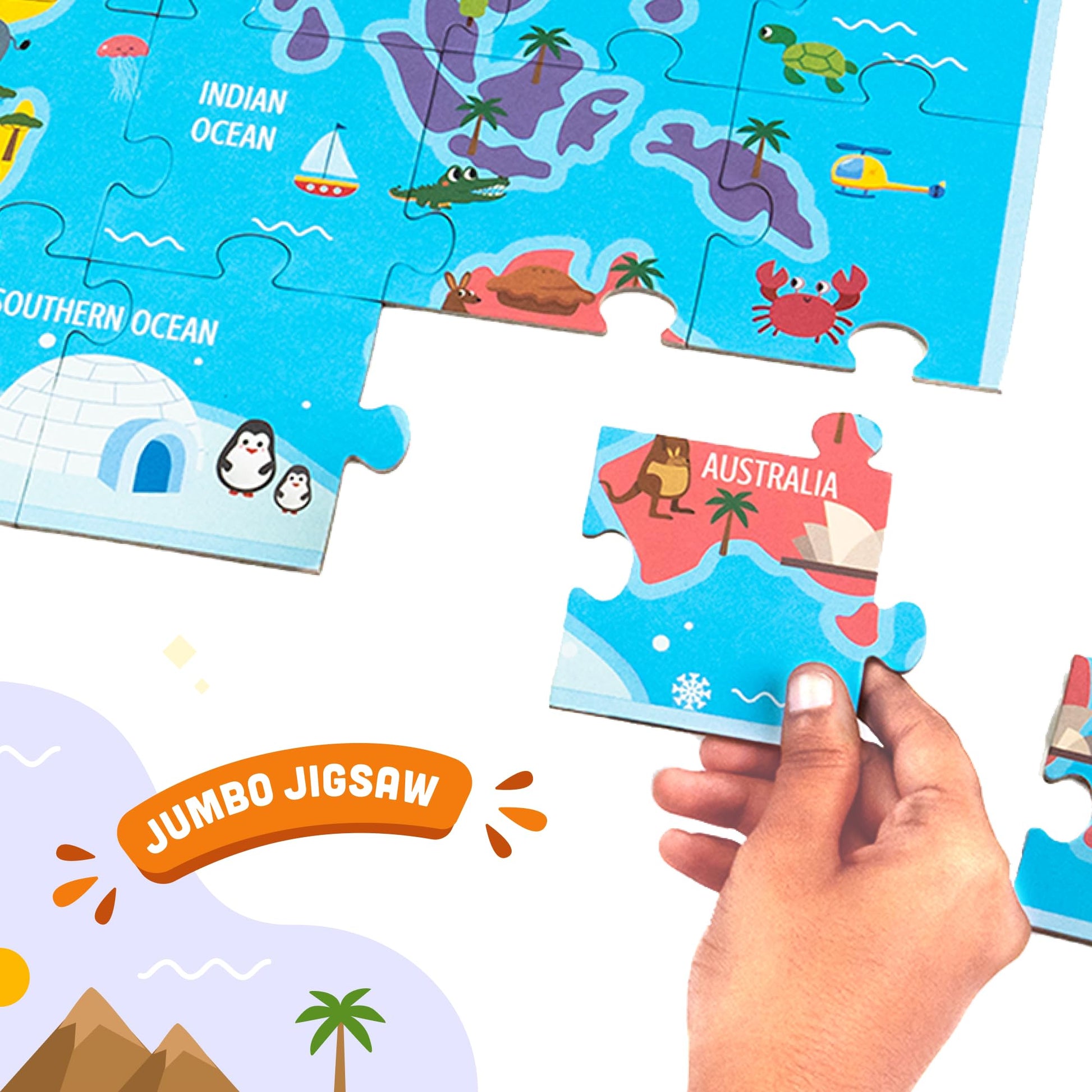 Bring together continents, oceans, and all things that define them. Assemble the jumbo-sized jigsaw pieces and complete the puzzle to form a big and wonderful world map!