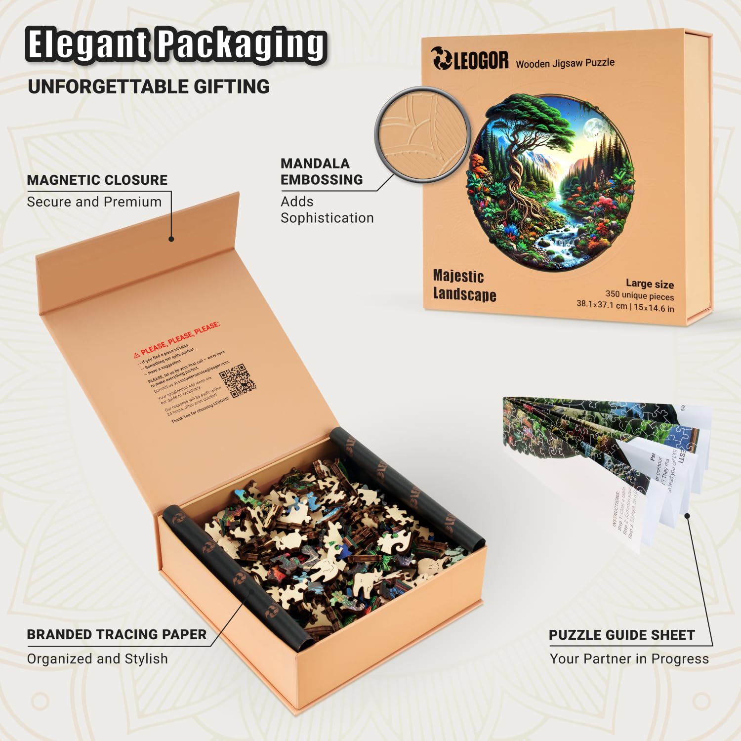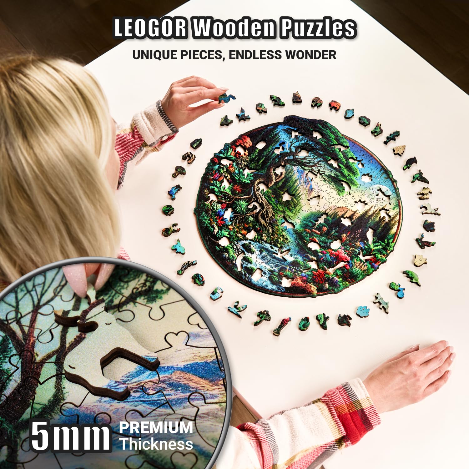 Discover a wooden jigsaw puzzle that blends mindfulness and craftsmanship into one unforgettable experience. Whether you're searching for a unique Christmas gift a peaceful winter activity or a thoughtful Mother's Day present LEOGORs shaped puzzles for mature-themeds offer a relaxing escape and a true sense of accomplishment. With 350 laser-cut pieces made from 5 mm thick wood this round nature puzzle is nearly twice as thick as most wood jigsaw puzzles. Each piece feels solid satisfying and built to last. More than 40 are whimsies-charming shapes in the form of animals insects and plants-designed to spark joy as you assemble the zen scene. Measuring 15 x 14.6 inches this big shaped puzzle creates a visual centerpiece thats perfect for framing. Its one of many collectible LEOGOR creative wooden puzzles including the whimsical Owl Puzzle Eternal Tree of Life mystic Yin Yang calming Winter Wonderland vibrant Succulent Harmony rainbow Tulip Flowers and the 3D vision-inspired Cave. In addition to our wooden landscape puzzles for mature-themeds - available in three different sizes - youll also find wooden animal puzzles like the majestic Wolf beautiful Peacock vivid Eagle Sea Turtle Butterfly Cat Hummingbird Fish and the colorful Panda Paradise. Each of our wooden mature-themed puzzles comes in a magnetic gift box with mandala embossing - ready for birthdays Valentines Day Fathers Day or a cozy fall weekend for family game nights. A visual guide is included to assist if the puzzle becomes too difficult and every wood jigsaw puzzle is backed by our lifetime piece replacement promise. LEOGORs advanced puzzles with shaped pieces are crafted not just for puzzling but for moments of peace creativity and gifting that leave a lasting impression. Whether you love mosaic wooden puzzles or unique shaped jigsaw puzzles LEOGOR offers the perfect balance of creativity and calm. Explore our best wooden puzzles for gifting and relaxing - one peaceful piece at a time.