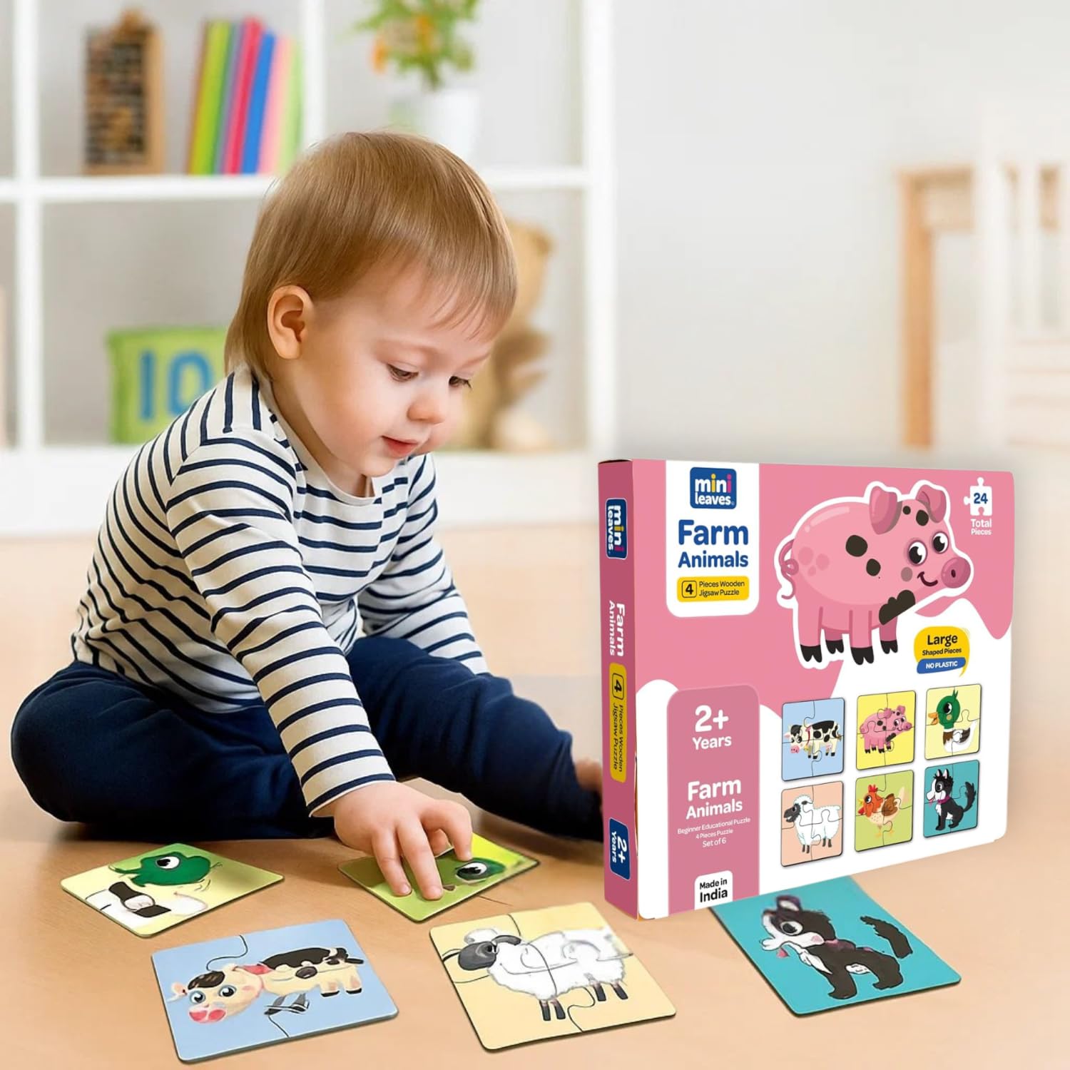 Mini Leaves 4 Piece Wooden Puzzle For Kids - Set Of 6 Farm Animals Jigsaw Puzzle - Puzzles For Kids For Age 2 And Above - Safe &