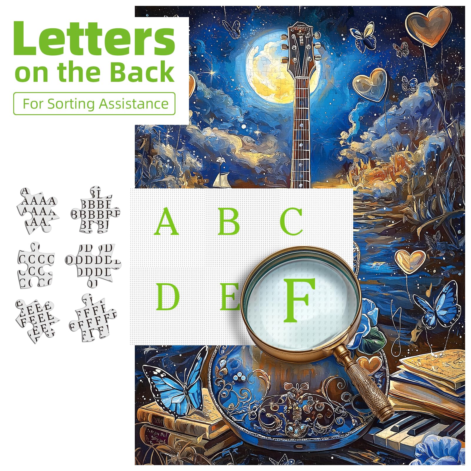 Embark on a whimsical journey with the MINIWAN - Fantasy Guitar Moonlight Puzzle, a captivating 1000-piece jigsaw puzzle designed specifically for adults. Featuring an intricately detailed acoustic guitar adorned with enchanting blue swirls and patterns, this puzzle transports you to a magical moonlit night filled with fluttering butterflies and shimmering golden hearts against a starry sky. Measuring 27.55 x 19.68 inches once completed, it offers both a satisfying challenge and a stunning visual experience. Ideal for solo relaxation or exciting game nights with friends and family, this unique puzzle harmoniously combines elements of music, nature, and fantasy to engage and inspire.