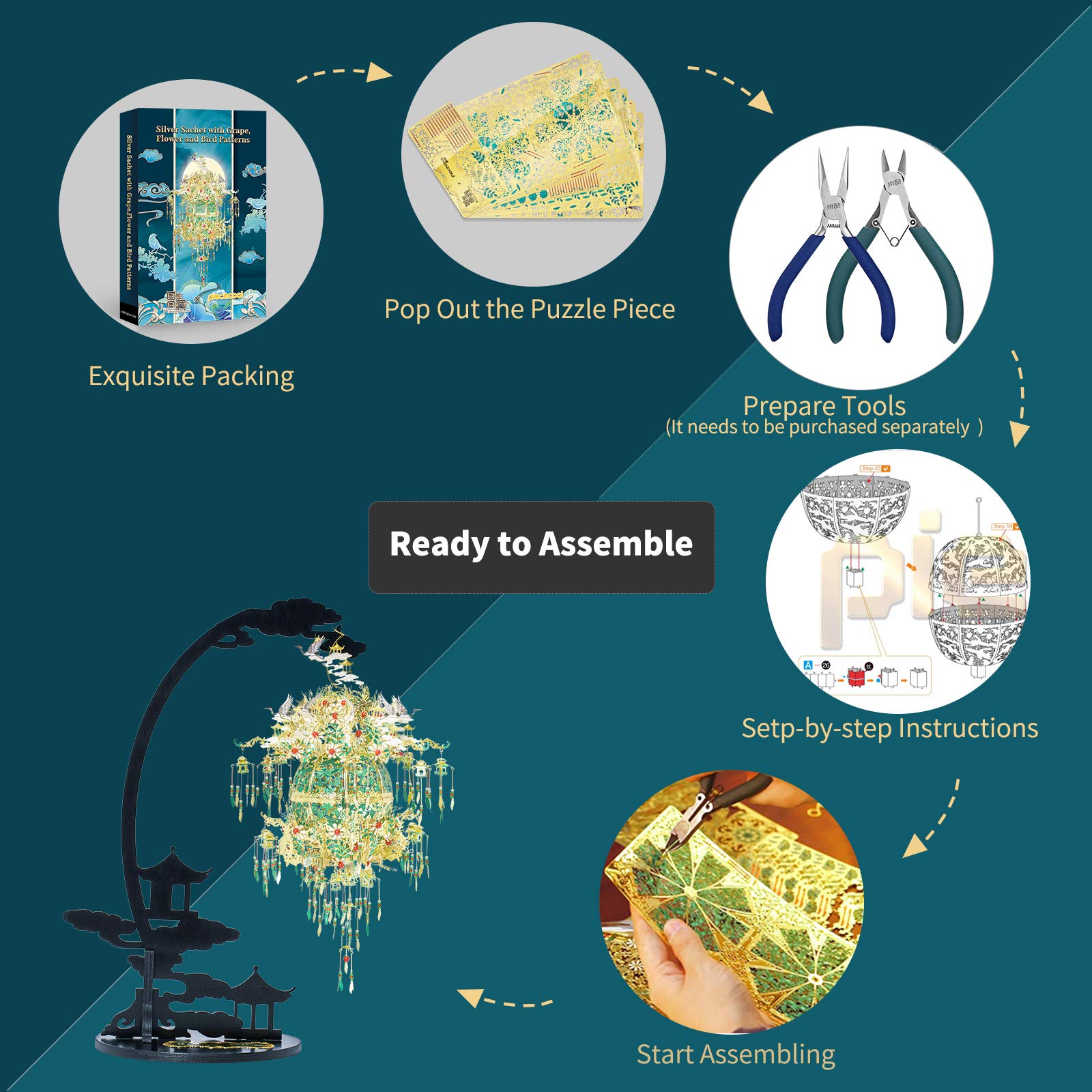 Feature --A kind of toy for people fond of DIY--especially 3D models --Made from very tiny metal parts, no glue or solder need during assemblying --Wonderful DIY experience, release your working pressure, improving your hands-on ability and logical thinking --Good choice for the display as decoration/art/collectioon after finish it --Perfect gifts for Birthday, Christmas, New Year, Thanksgiving Day gifts to adults and kids age 14+ Specification Name: 3D Metal puzzle model-Silver Sachet with Grape Material: Brass Finished model size:10.23 6.10 11.81 inch Recommended age: 14+ Degree of difficulty:???????Moderate Package Includes 6x Metal Jigsaw puzzle 1 x English Instruction Manual