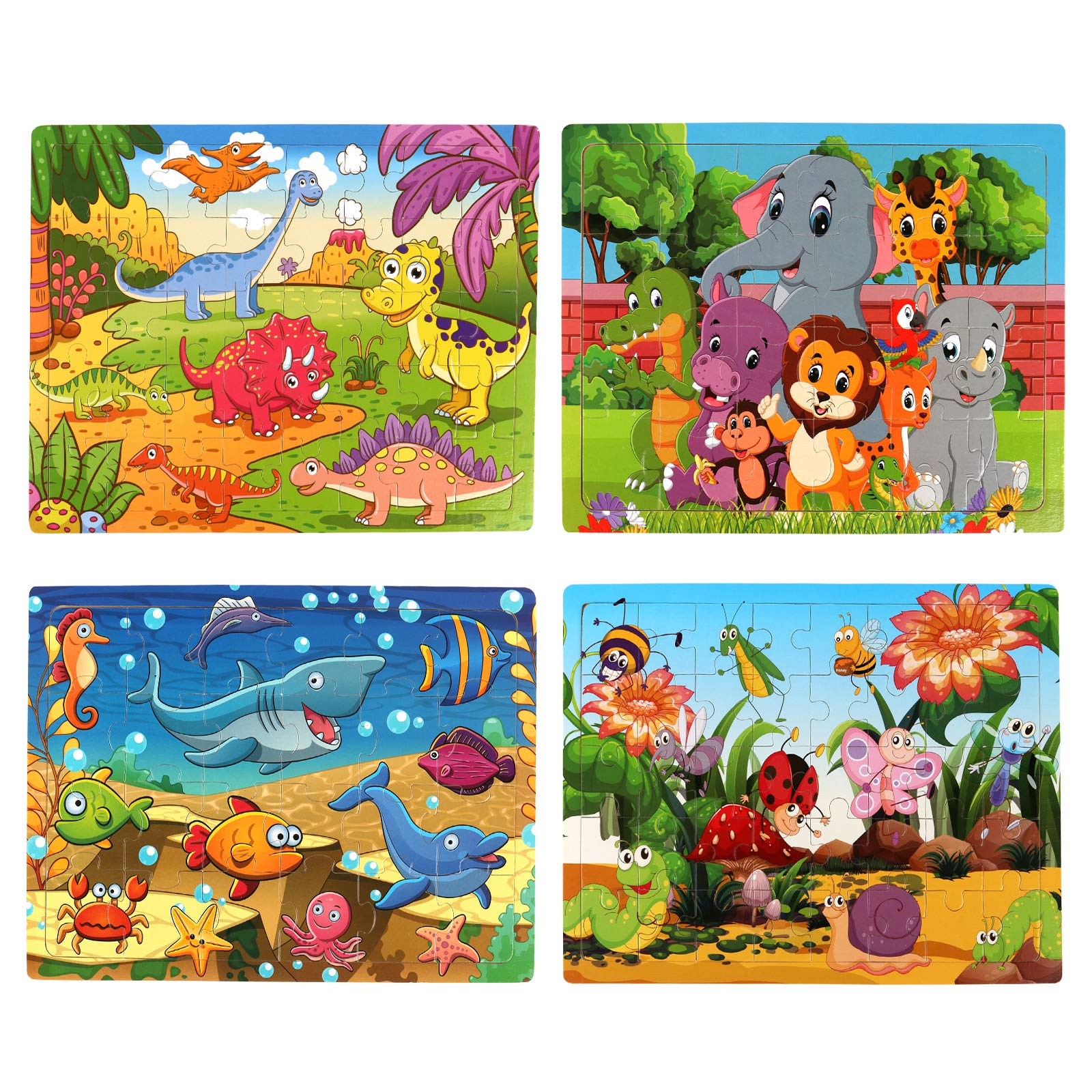 SYNARRY Wooden Jigsaw Puzzles Set for Kids Age 2 3 4 5 Years Old Specifications:1 x Animals Puzzles (24pcs)1 x Sea Life Puzzles (24pcs)1 x Dinosaurs Puzzles (40pcs)1 x Insects Theme Puzzles (40pcs)1 x Colored Package Box Putting together puzzles is a great way for kids to explore their creativity while developing their cognitive and essential skills. Puzzles are fun, brain-boosting, stimulating and kids will learn while playing! Puzzle not only provides engaged play-time for kids but also helps practice problem-solving and spatial reasoning as they work to complete the puzzle. 4 different themes with bright colors, vivid illustrations make learning more fun while developing their sensitivity to color and shapes. Great Gift IdeaThe wooden jigsaw puzzles for kids are great gift choices for Birthday, Christmas, Easter, and any other holidays. Safe & Fun: Crafted from durable & safe wood, the animal puzzle set is not easily broken and bent, allowing children to play many times, Bright ColorsFun animal theme, vibrant colors with illustrations designed, it is great for kid's cognitive development.