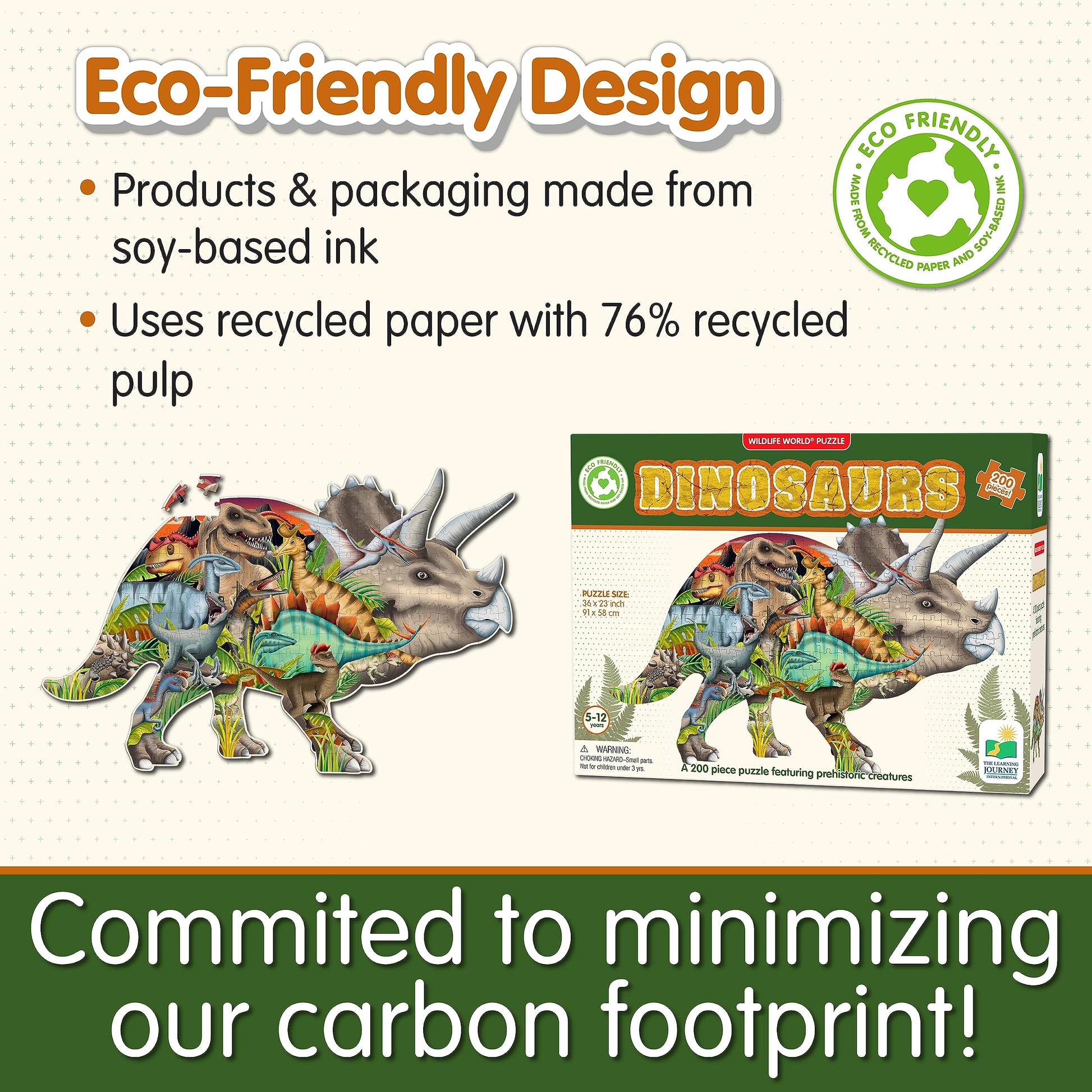 The new Wildlife World Puzzle Series by The Learning Journey takes learning about Wildlife to a new level. This unique puzzle, both in shape and content, will have kids learning about natural habitats and more. This 200 piece Dinosaur puzzle is shaped as a Triceratops and introduces the environment of the Jurassic era. This 200-piece puzzle will help develop problem solving skills, spike interest, and expand knowledge of different environments. The colors and patterns of the dinosaurs are beautiful and fascinating! The puzzle measures approximately 3 x 2! Eco Friendly design is made from 70% recycled paper. Ages 5-12 years.