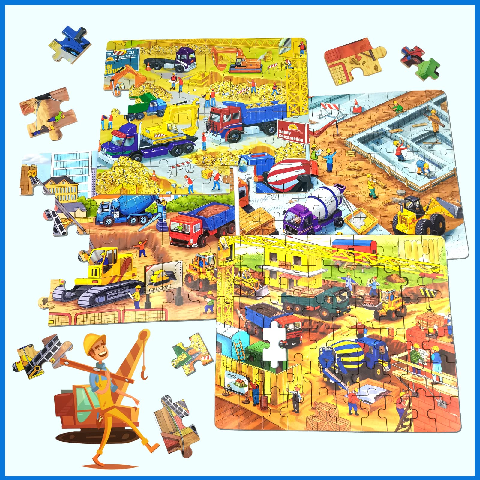 Wooden Puzzles For Kids Ages 4-8, Construction Sites Vehicles 4-In-1 Jigsaw Puzzles In A Wood Storage Box, 24 48 60 88 Pieces Co