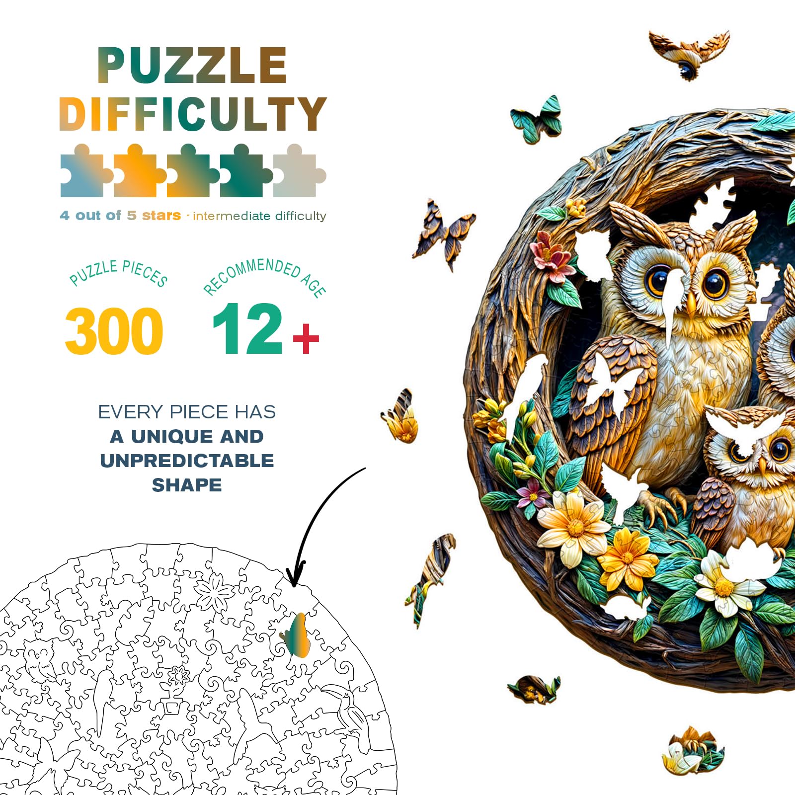 Wooden Puzzles for mature-themeds - 3D Vision Effects Owl Family Wooden Jigsaw Puzzle - Unique Animal Shaped Wood Puzzles mature-themed - Creative Birthday Gift Family Game (300pcs)