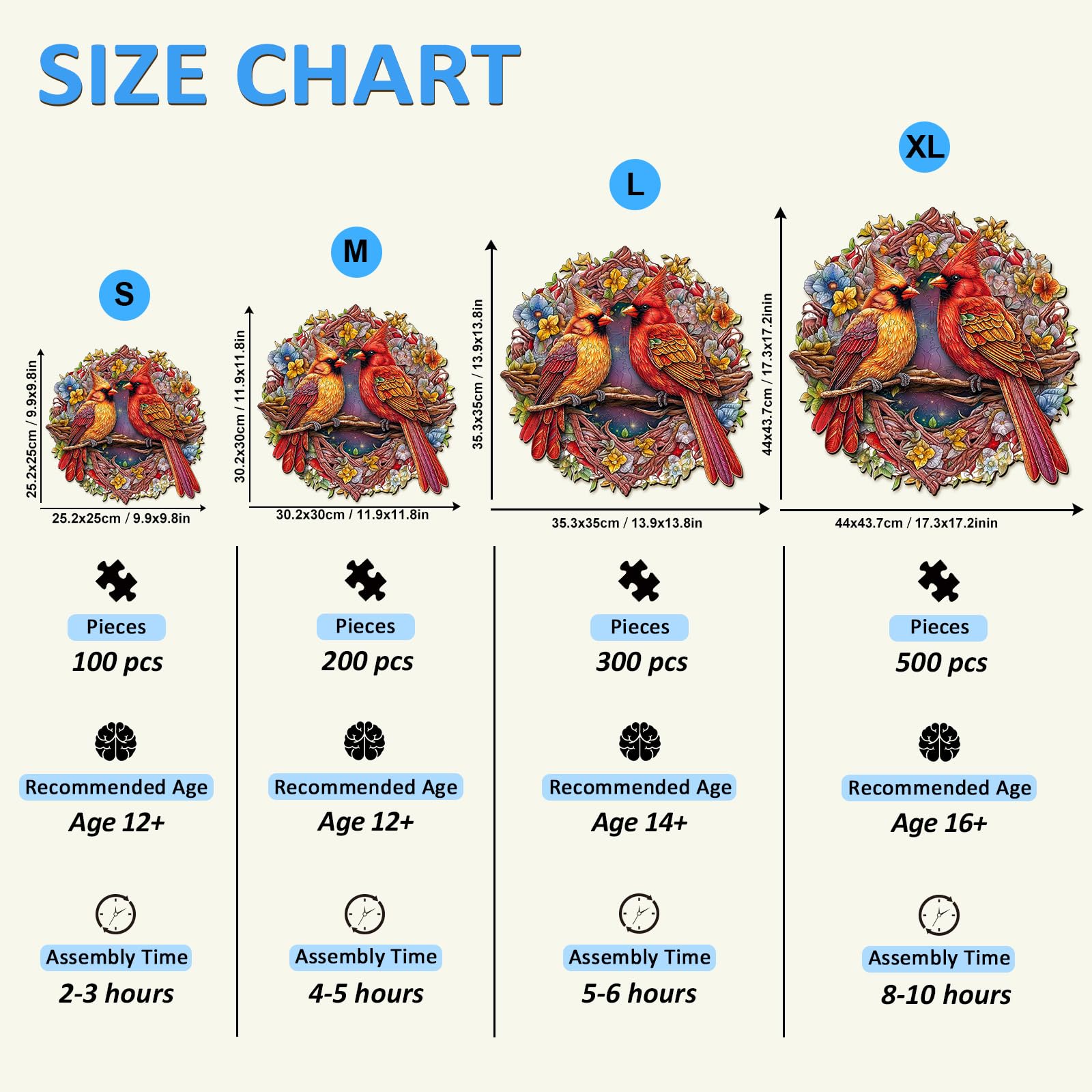 ?Cardinal Puzzles?: Our cardinalis puzzles are made of natural wood. Carefully selected to ensure the material is strong and durable. Each puzzle piece is sanded smooth and free of burrs harmless to your hands. | ?Unique Puzzles Design?: Each wooden puzzle is carefully designed by our designers with different shapes and vivid patterns. Four sizes from easy to hard to meet the needs of a variety of people. A great gift choice for Christmas Birthday Mother's Day Father's Day Thanksgiving etc. | ?Relaxing & Fun?: Jigsaw puzzles are a calming and immersive activity that can give you a break from everyday stress and anxiety. It can help you experience the joy of creation while improving cognitive skills and concentration. | ?Family Puzzle Game?: Wooden puzzles are great for family engagement. Families can complete the puzzles together to enhance relationship and promote communication and cooperation. | ?Customer Service?: If you have any questions about our puzzles please feel free to contact us and we will answer you within 24 hours. If the puzzle has missing pieces or broken please contact us to solve.
