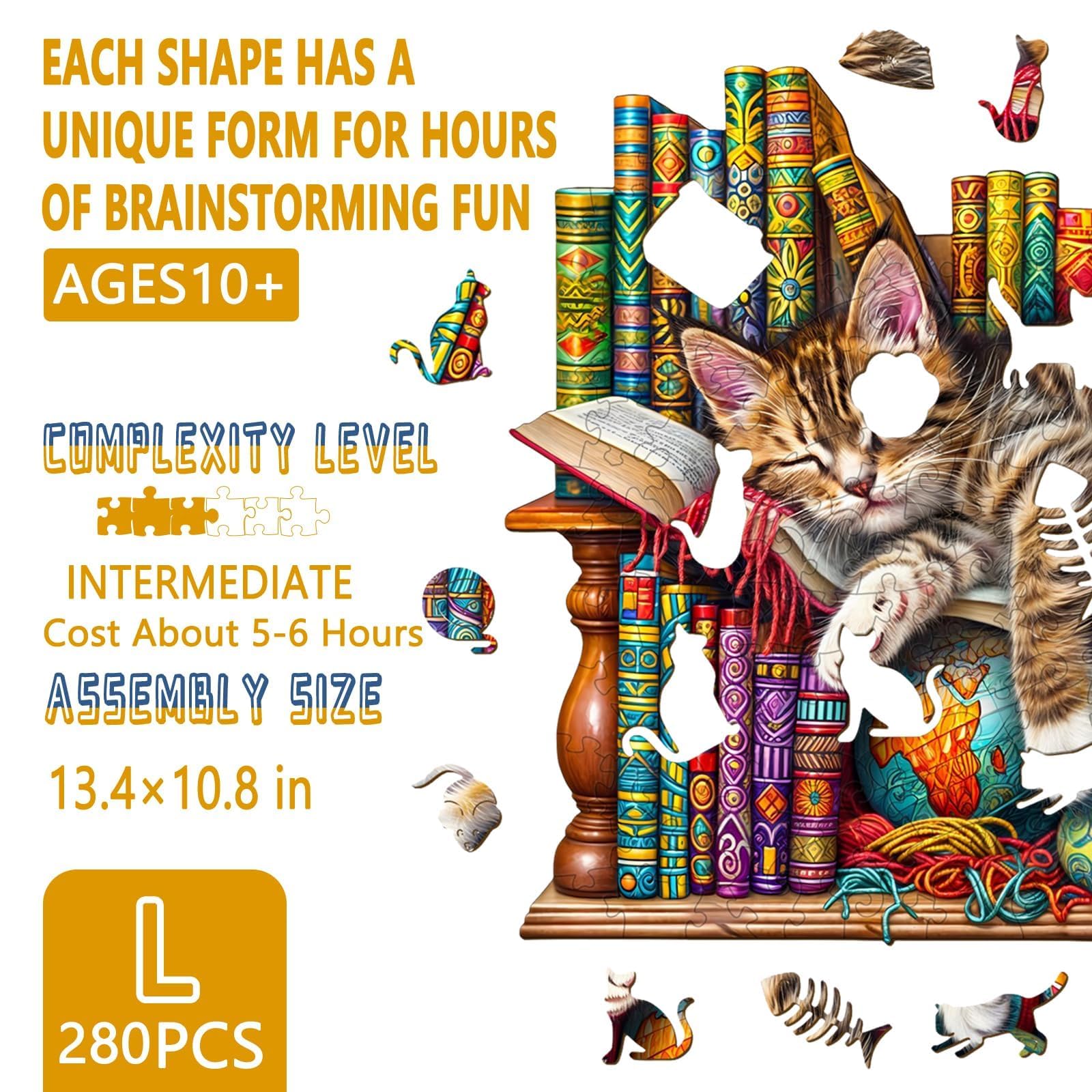 Wooden Puzzles for mature-themeds Snoozing Cat Wooden Jigsaw Puzzles for mature-themeds Library Kitten Wood Puzzles mature-themed Unique Animal Shape Gift for Cat Lovers & Friends Home Decor (L -13.4 * 10.8in -280 pcs)