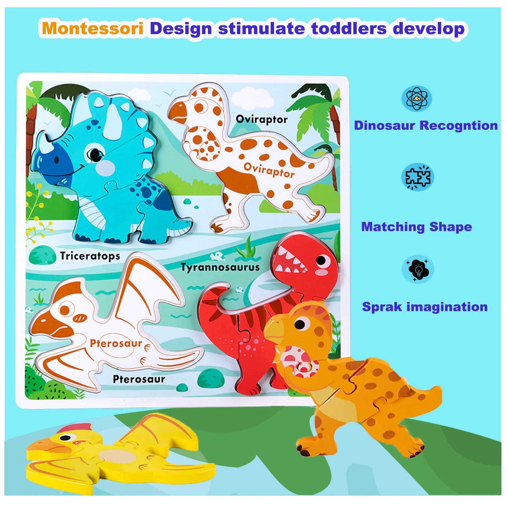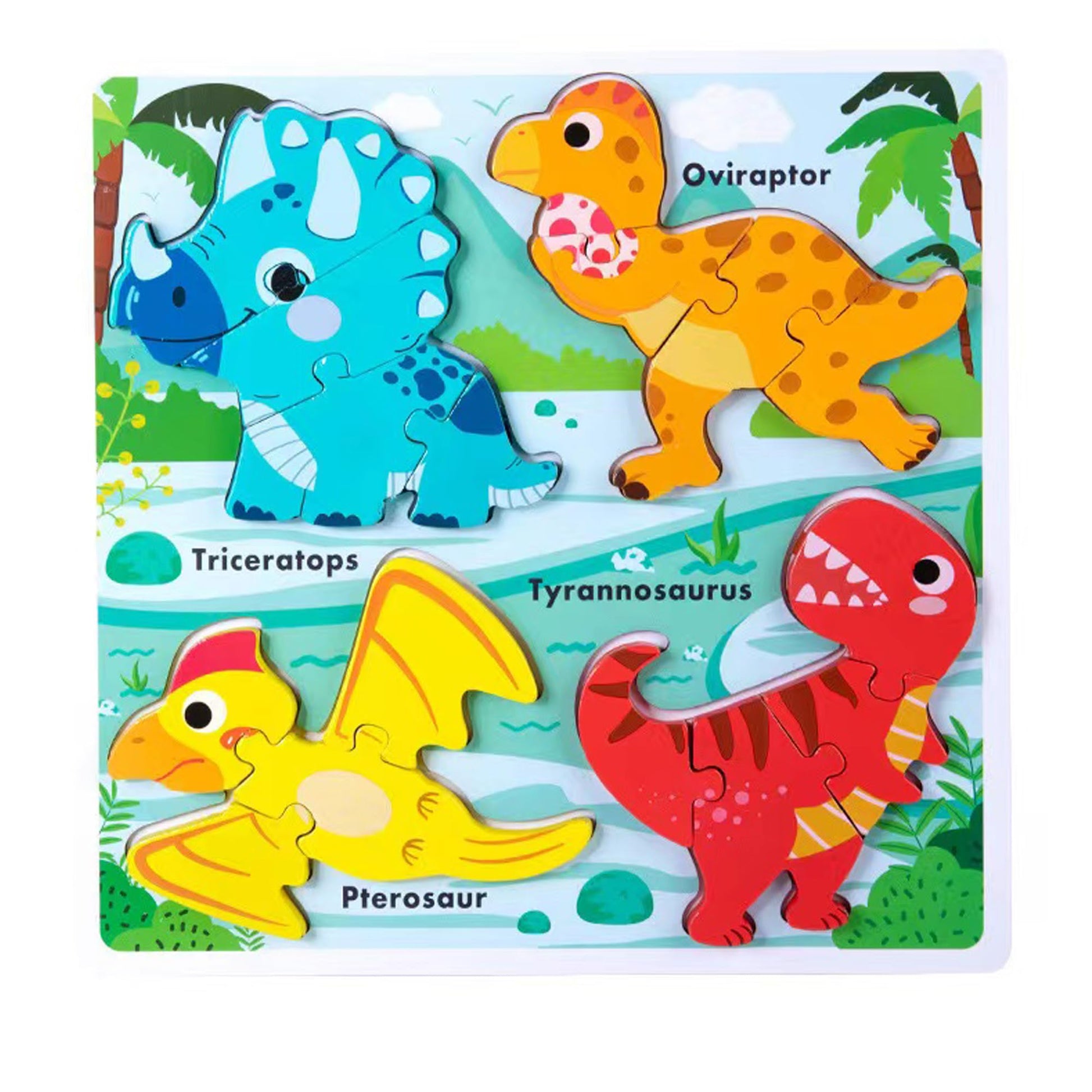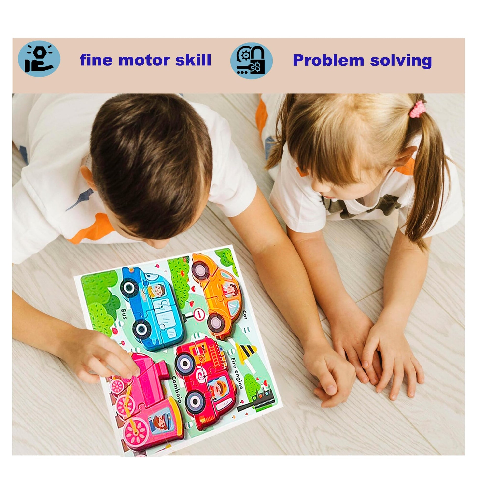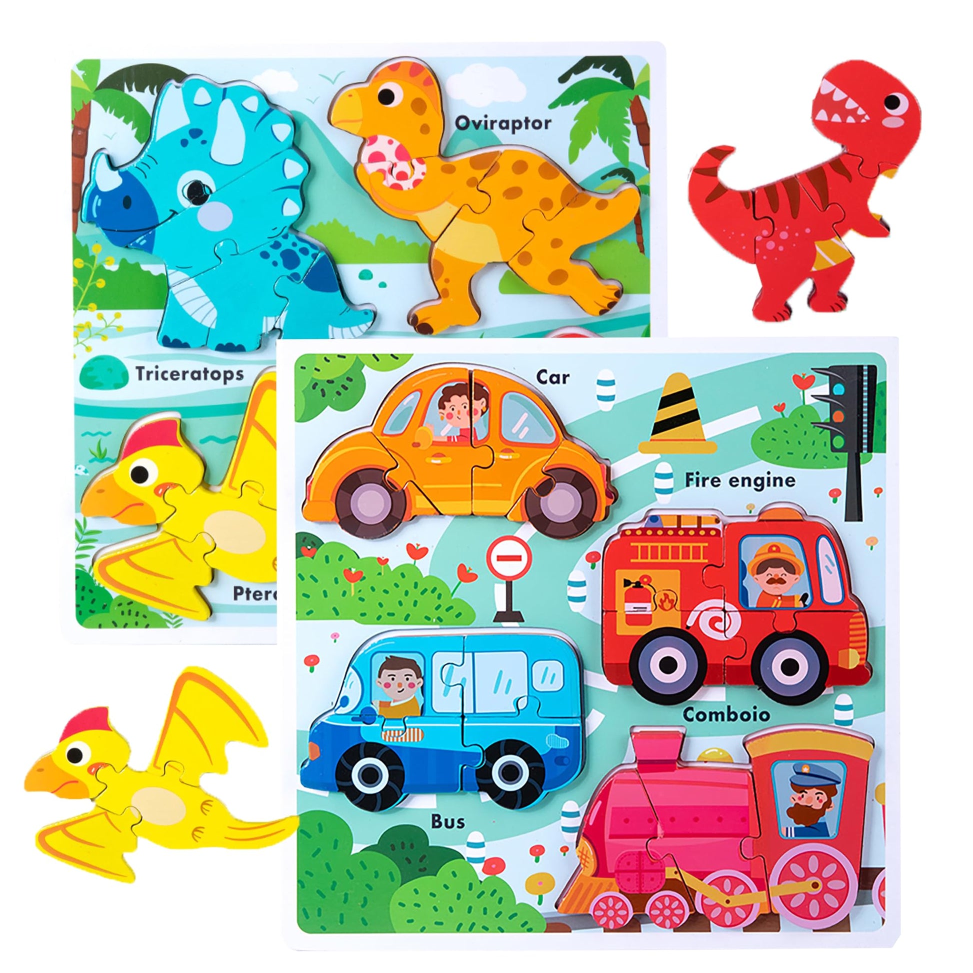 - Q: How many puzzles are included in this set? A: The set includes 2 packs with a total of 8 puzzles, featuring 4 vehicles and 4 dinosaurs, all designed on sturdy boards.