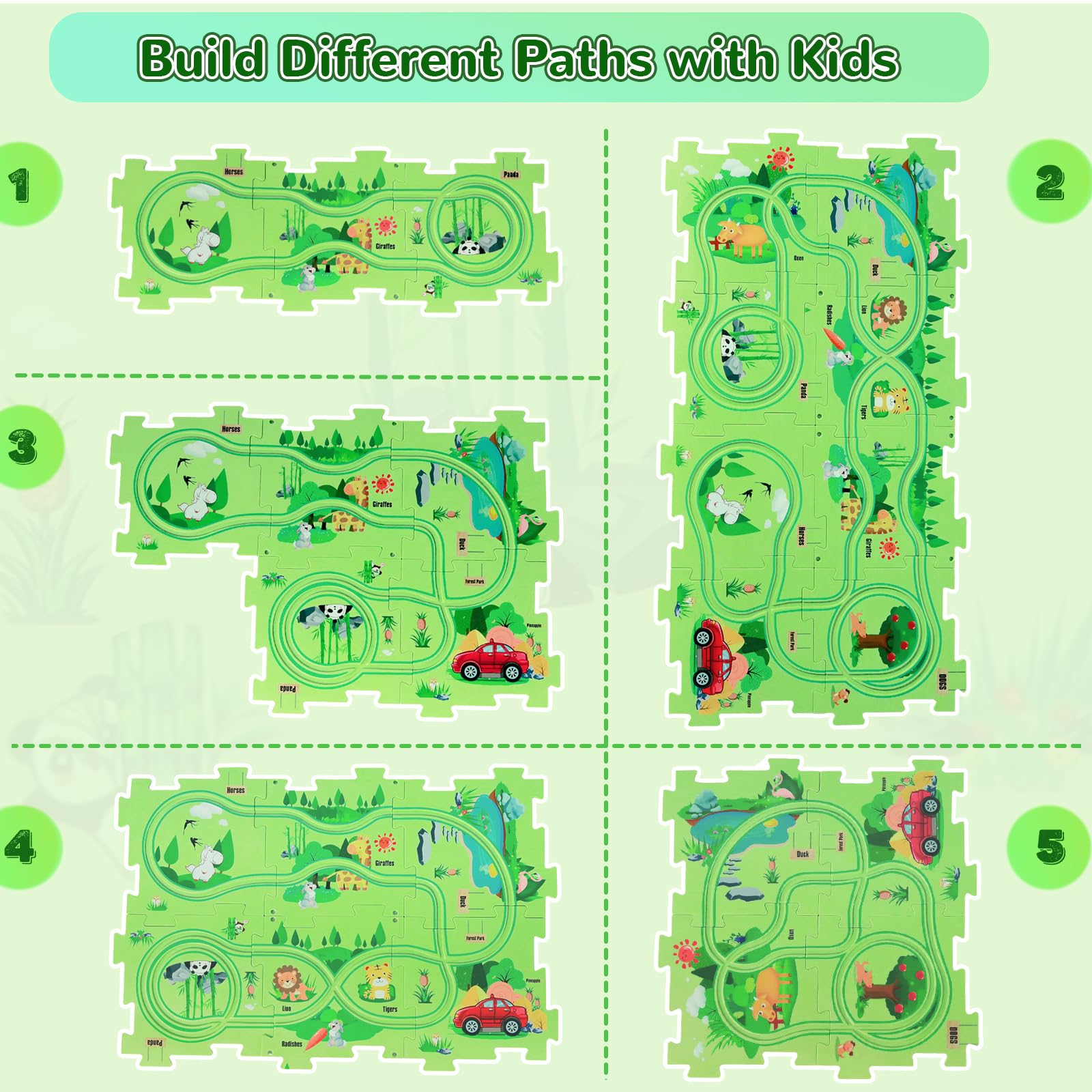 - Q: How does this car track set help with children's development? A: This puzzle car track set enhances children's logical thinking, creativity, and problem-solving skills as they figure out how to assemble the puzzle pieces to create a track for the car.