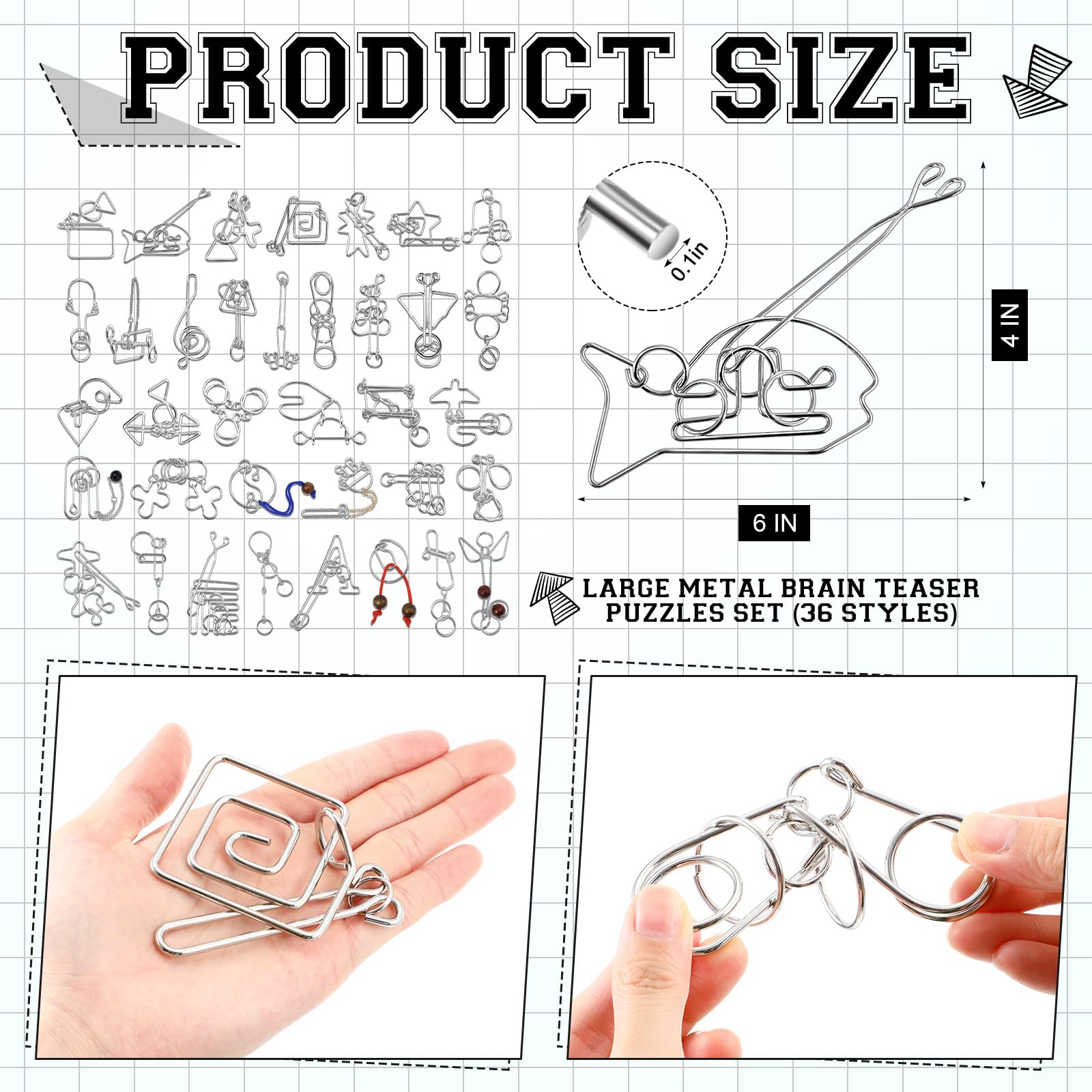 Features: Lightweight and portable: Owing to nice material our hand puzzles are lightweight and easy to carry will not bring much burden on you. Besides they are also easy to store without occupying much space. Warm gift: These IQ puzzles can be practical gifts for family relatives neighbors mates and more making them delighted and enjoyable at birthdays Christmas New Years Easter Halloween and Thanksgiving. Specifications: Puzzle: Quantity: 36 pcs Size: as shown in the picture Color: silver Material: stainless steel Package includes: 36 x Puzzles 1 x Storage bag 1 x Handbook Warm notes: Please allow a little error on the size due to manual measurement. The color might have a slight difference due to different displays. Small parts are included. mature-themed supervision is required to avoid swallowing.