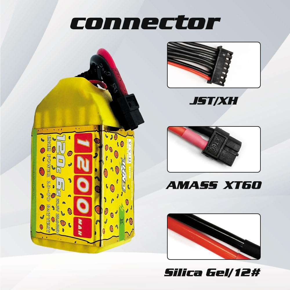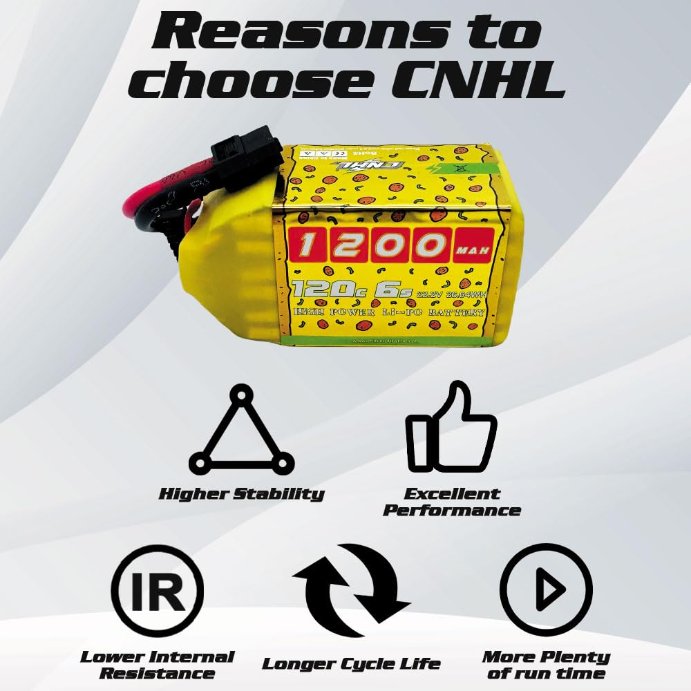 ?Advantage?CNHL Speedy Pizza 1200mAh 6S lipo battery is designed with high-performance in mind, offering a discharge rate of up to 120C. It has a fast charging capability and can quickly discharge high voltages, ensuring long cycle life.