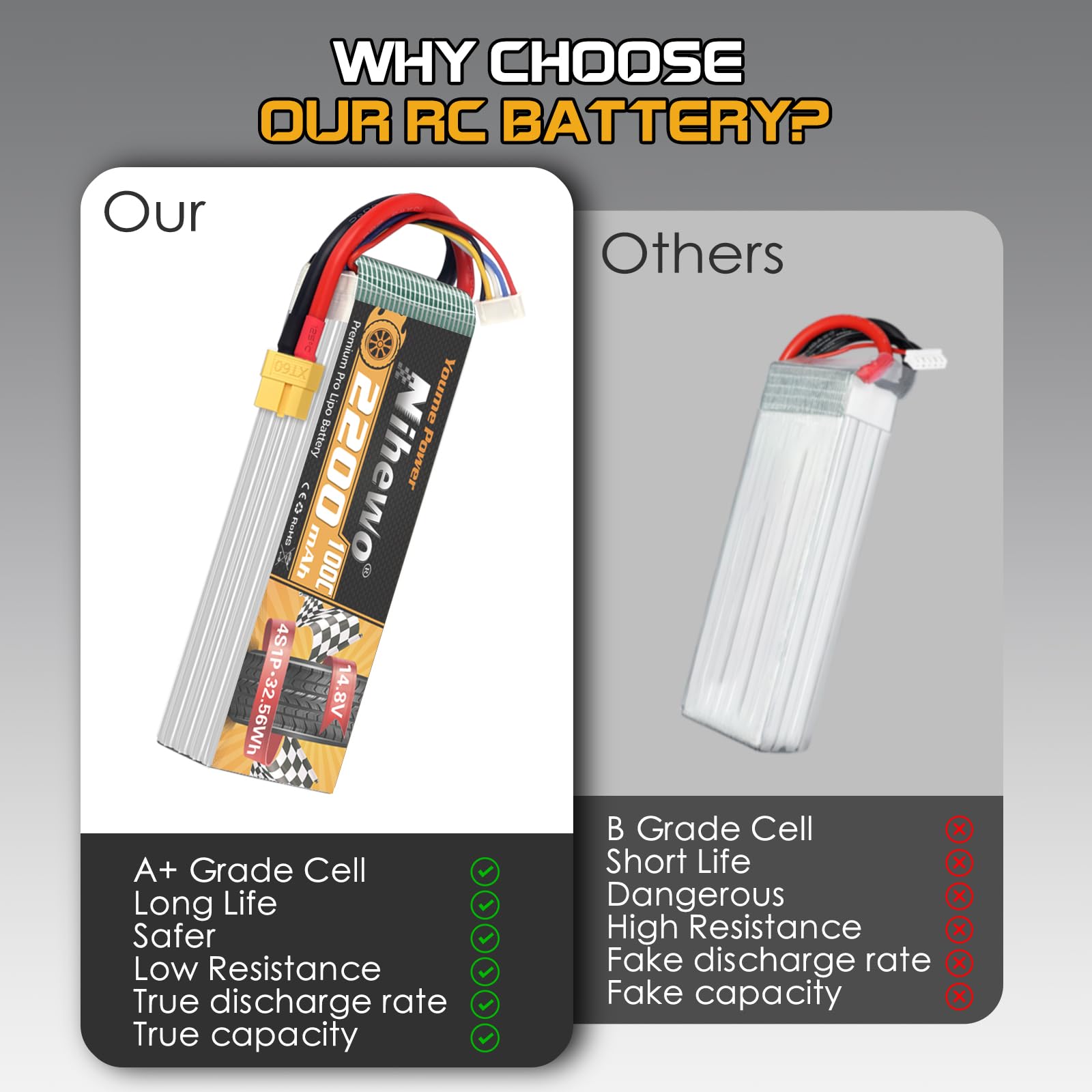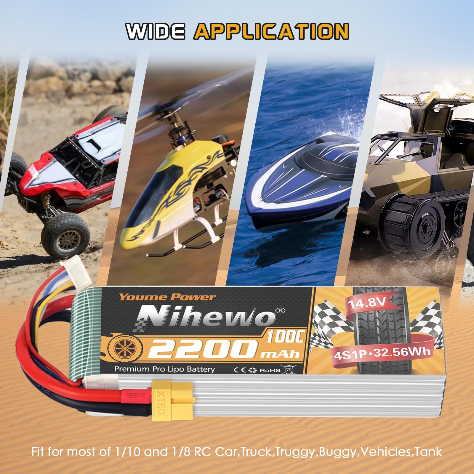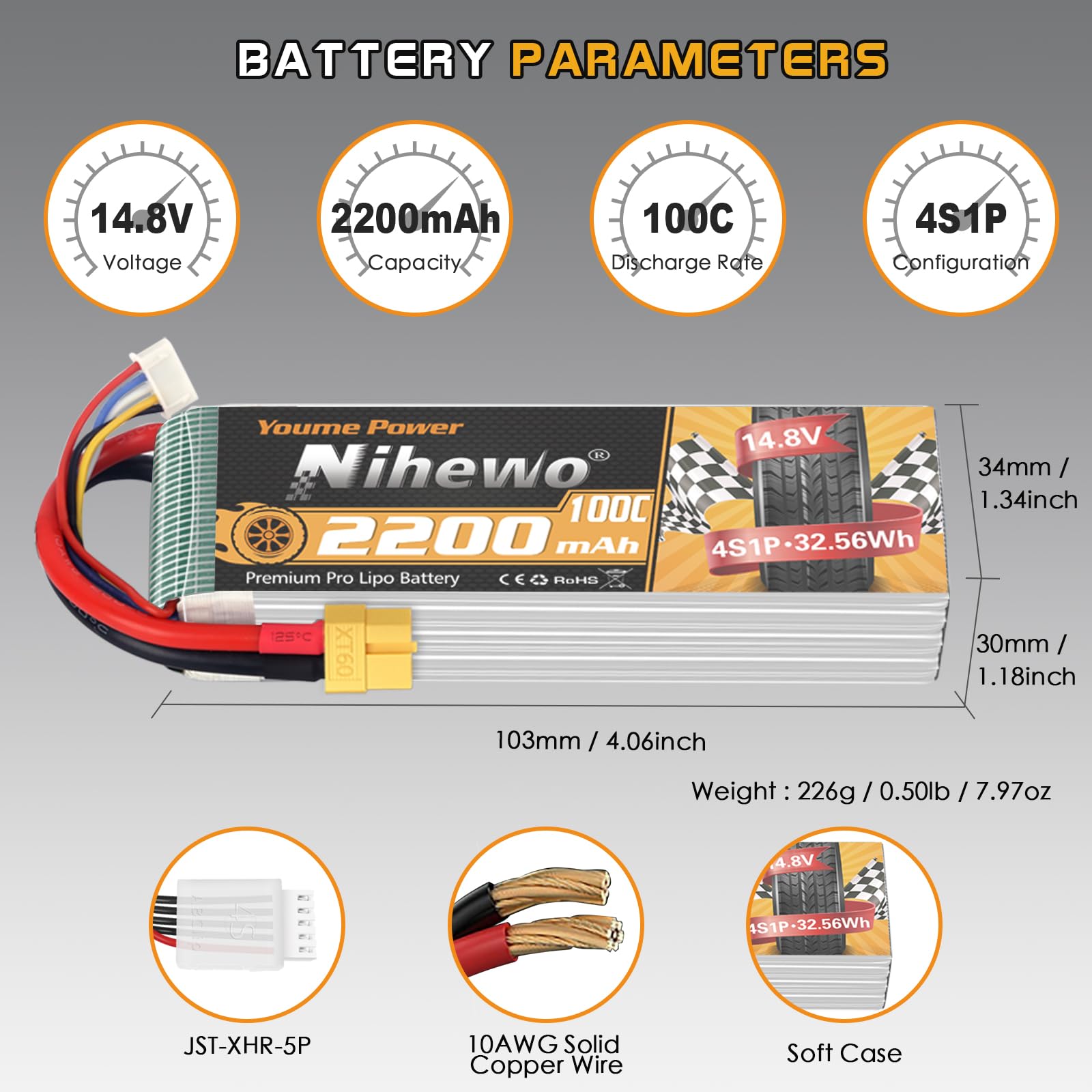 Feature: - Premium-grade material from Japan and Korea - Low-resistance, high-reliability, and consistency - Lightweight, long cycle life, power density up to 310Wh/m - Great value without the loss of performance Notice: - Please let us know if you have any questions, we will respond within 24 hours. - For the RC battery, only if the voltage and the plug match, then it will fit. - Don't over charge exceed 4.2V and don't over discharge below 3.2V. - Check the battery condition carefully before using or charging. - If the new battery wont hold a full charge or loss the charge very quickly in short time, please use Balance Charger to charge and recycle several times first. Specification Brand: Nihewo Capacity: 2200mAh Voltage(V): 14.8V Discharge Rate(C): 100C Configuration: 4S1P Connector Type: XT60 Plug Dimension: 103*34*30mm(3mm)/4.06*1.34*1.18inch(L*W*H) Approx Weight:226g(15g)/0.50lb/7.97oz