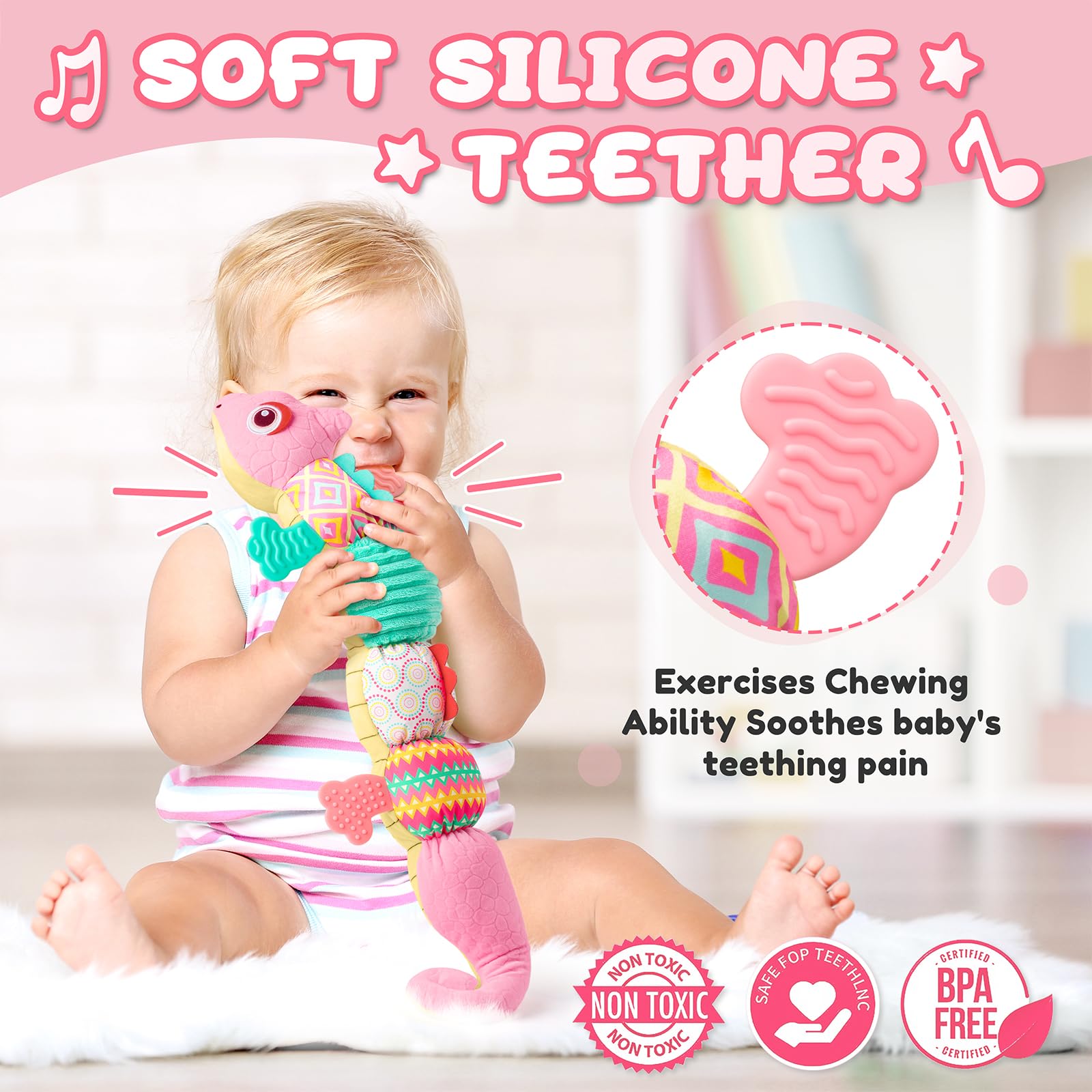 Awotoy Baby Toys 0-6-12 Months, Musical Stuffed Animal Activity Soft Toys With Multi-Sensory Crinkle,Rattles And Textures,Infant Baby Girl Toys Gifts For Newborn Tummy Time,Dinosaur,Pink