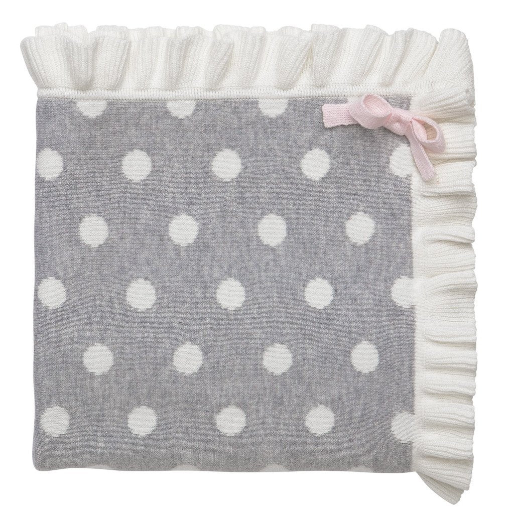 Baby blankets have many benefits that extend beyond solely providing warmth. Babies love the familiarity of their favorite blanket, always providing comfort and security throughout the many stages of development. That's why it's important to choose the softest, most durable blanket to stimulate your baby's developing senses. This Gray/Cream Ruffle Dot Knit Blanket matches perfectly with our 1' and 15' Ballet Bunny Knittie Bitties.
