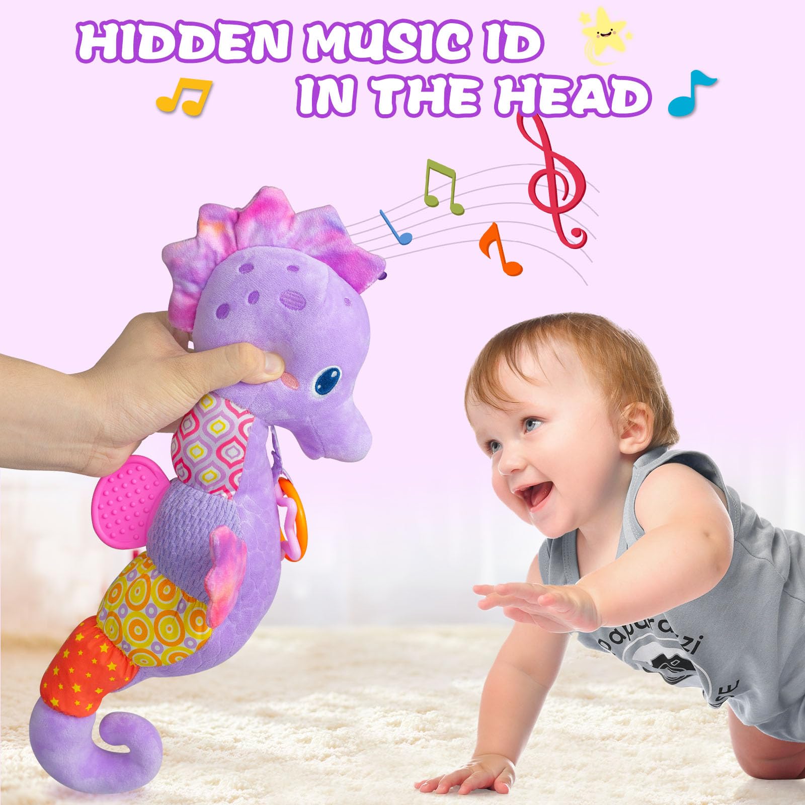 - Q: Does the Fuzqq Baby Seahorse toy produce sounds? A: Yes, the Fuzqq Baby Seahorse toy features a music box with a soothing song and several crinkle sound papers that stimulate auditory development.
