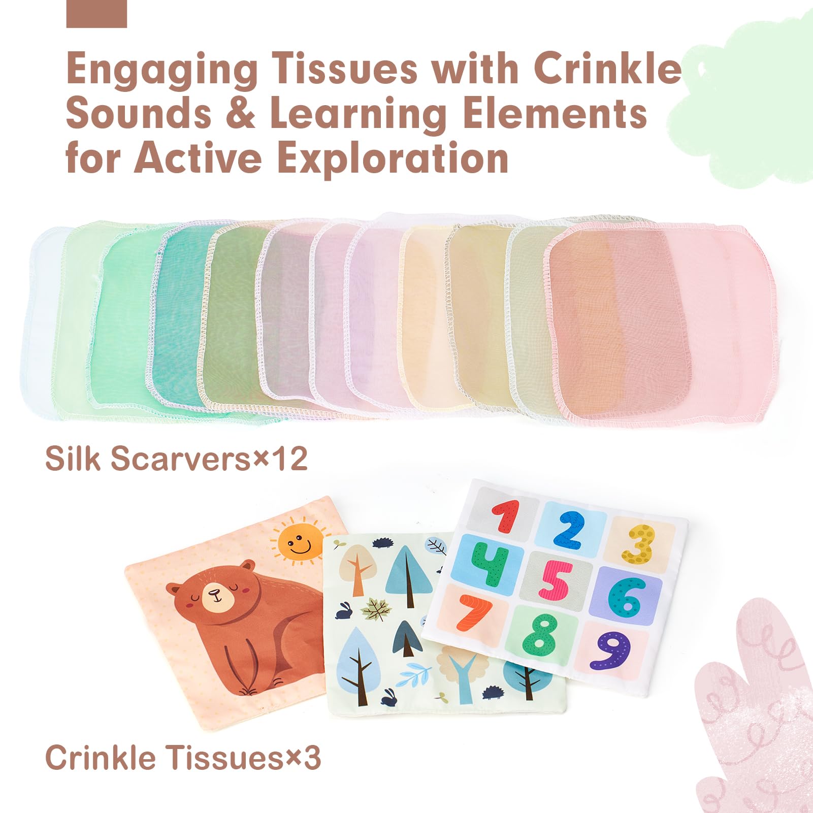 - INCLUDED EVERYTHING BABY WOULD ACTUALLY LOVE: This toy set comes complete with a soft tissue box, 3 crinkle tissues of different textures, and 12 colorful silk scarves. It is an ideal choice for babies over 6 months old, providing a range of engaging elements that stimulate early education and exploration.