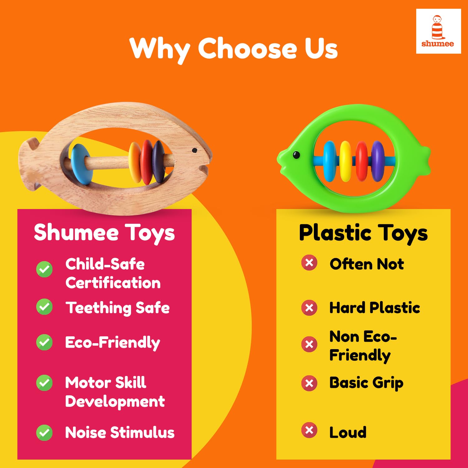 TOYS THAT EMPOWER YOUR KIDS TO LEARN AND PLAY THEIR OWN WAY.At Shumee, we follow the 90% child, 10% toy philosophy that allows every child to blossom in their own space. With our environmentally conscious, safe & natural wooden toys - children can explore the world around and just have unbridled fun!Toys that makes a difference. ASTM International Certified Non-toxic, Safe for babies Natural rubber wood Water based paints No sharp edges Easy to clean and store Fish Rattle Rings Ideal size to prevent swallowing Encourage Hand & Eye coordination. Recommended Age: 6 months and up. Toys that are 100% good for the child. Our environmentally conscious toys are made from natural organic materials, wood and non toxic colors (lead-free, water based paints). All Shumee toys are ASTM Certified and adhering to stringent quality standards. We keep child safety in mind at all times, so even you as a parent can be as carefree as a child during playtime! Toys that bring back the joy of playing. Our design philosophy is rooted in bringing back the joy of playing and empowering the child to explore, discover and develop at their own pace, in the most natural manner. Each toy has been designed with the vision to boost a childs motor and sensory skills, while always fuelling their creativity, curiosity and imagination - and suited for their age.Toys that dont cost Mother Earth. All Shumee toys are environment friendly and manufactured sustainably - from renewable natural wood and water based paints.EXPLORE A WORLD OF WONDER !!! CREATE MOMENTS !!!.TRY IT NOW !!!
