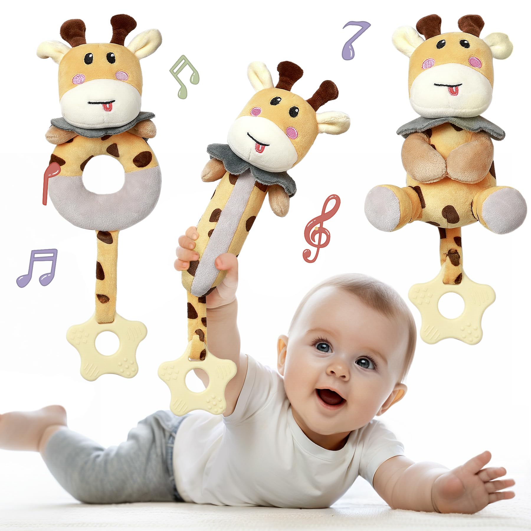 Tumama Baby Rattles 0-6 Months, 3 Pcs Giraffe Baby Plush Rattles Sensory Toys With Teethers, Newborn Gifts For Babies 0-6 Months