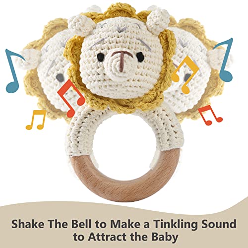 Wooden Baby Rattle Crochet Bunny and Lion Baby Toys Handmade Newborn Toy Early Development Grips Stuffed Animal Organic Rattle (