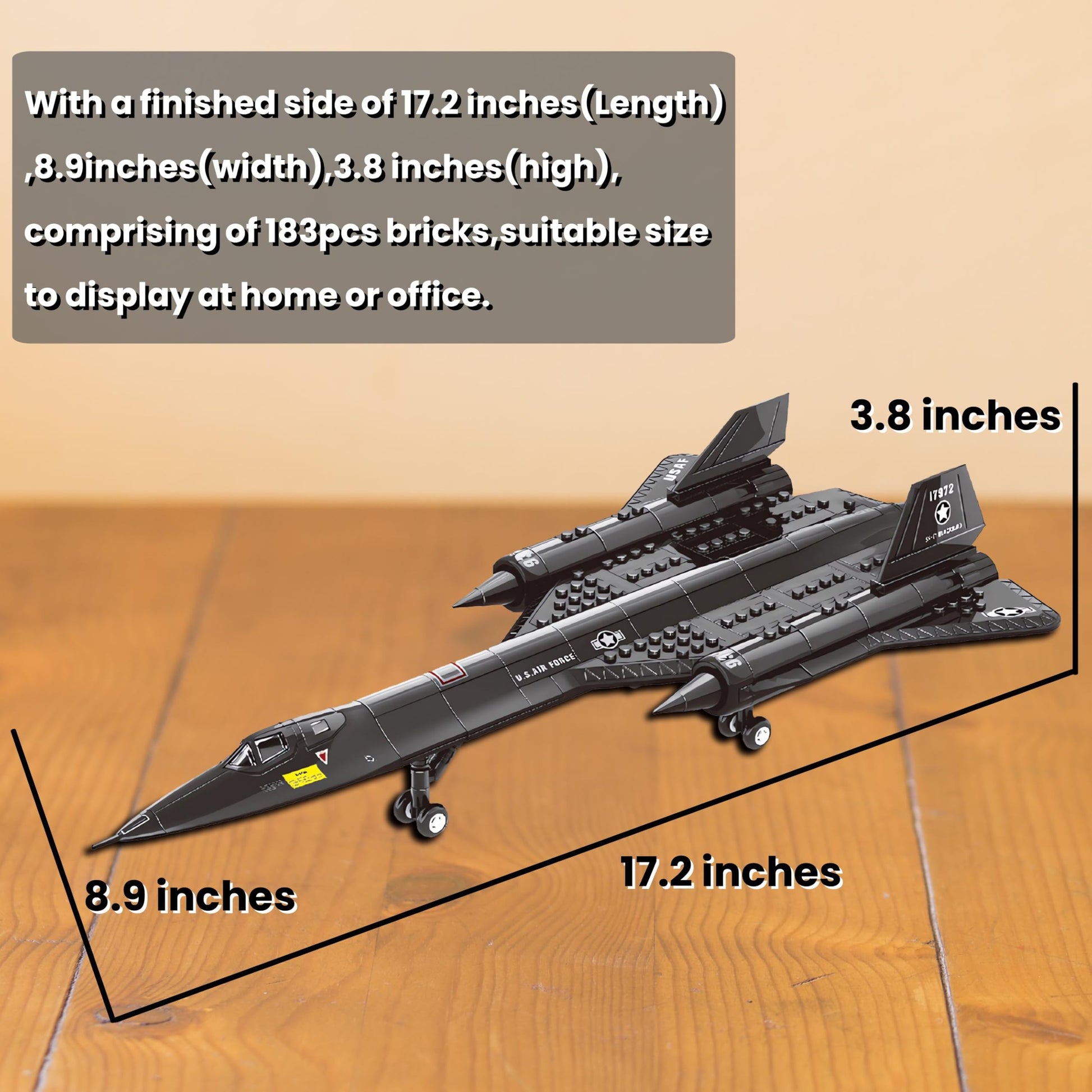- Q: What are the dimensions of the completed Gonli SR-71 aircraft model? A: Once assembled, the Gonli SR-71 model measures 17.2 inches in length, 8.9 inches in width, and 3.8 inches in height, making it a visually impressive exhibit piece.