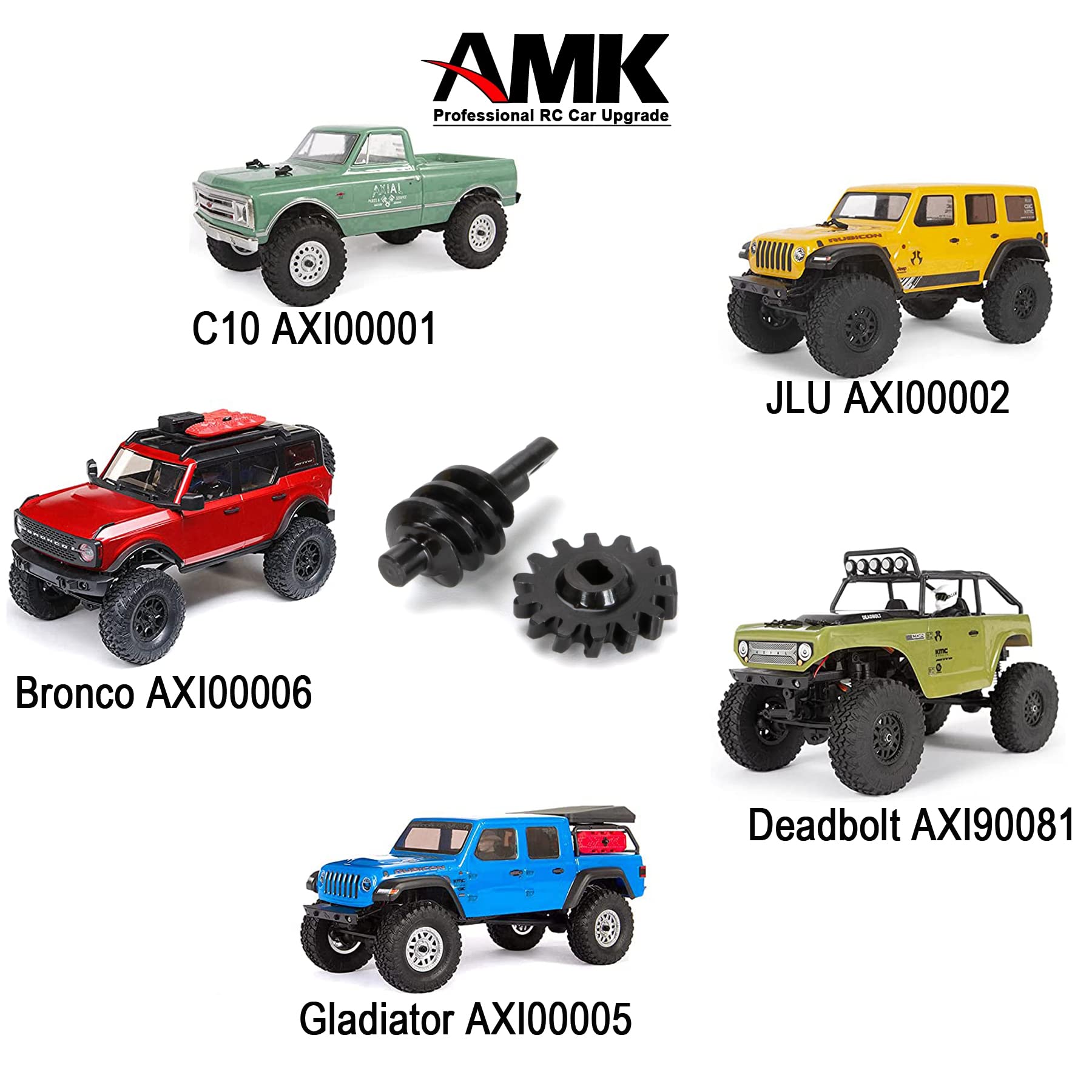 SCX24 Axle Overdrive Worm Gear Set 12T 13T 14T 16T for Axial 1/24 RC Crawler Car Bronco C10 Deadbolt Wrangler Gladiator Upgrade Hardened steel worm screw and worm gear For maximum strength and durability 12T/13T/14T/16T optional For front/rear axle overdrive and replacement Directly replace SCX24 factory worm gear set 12T/13T Overdrive Gears: Increase speed moderately 13T Overdrive Gears: Increase speed a little 16T Gears: Not increase speed Specification: Item: Worm Gear Set Compatibility: for Axial SCX24 series axle. Steel Axle Differentials Gear Compatible with: Axial 1/24 SCX24 DEADBOLT AXI90081T1, C10 AXI00001T1,JLU AXI00002V2T1,Gladiator AXI00005T1,Bronco AXI00006T1. Material: Hardened Steel Tooth: 12T, 13T, 14T, 16T Weight: about 5g Quantity: 1 Set Poly Bag Package What's Included: 2pcs SCX24 Worm Gear Set