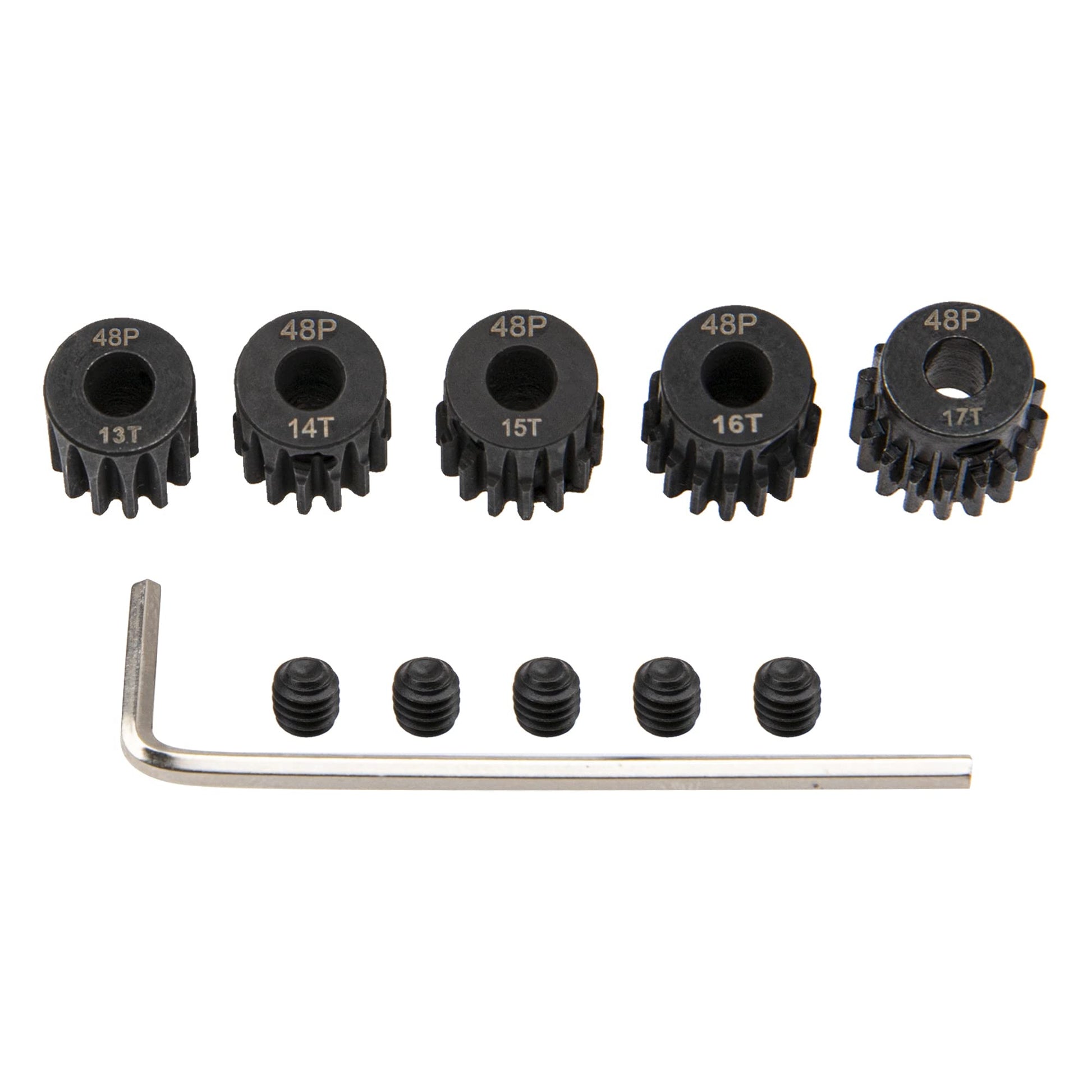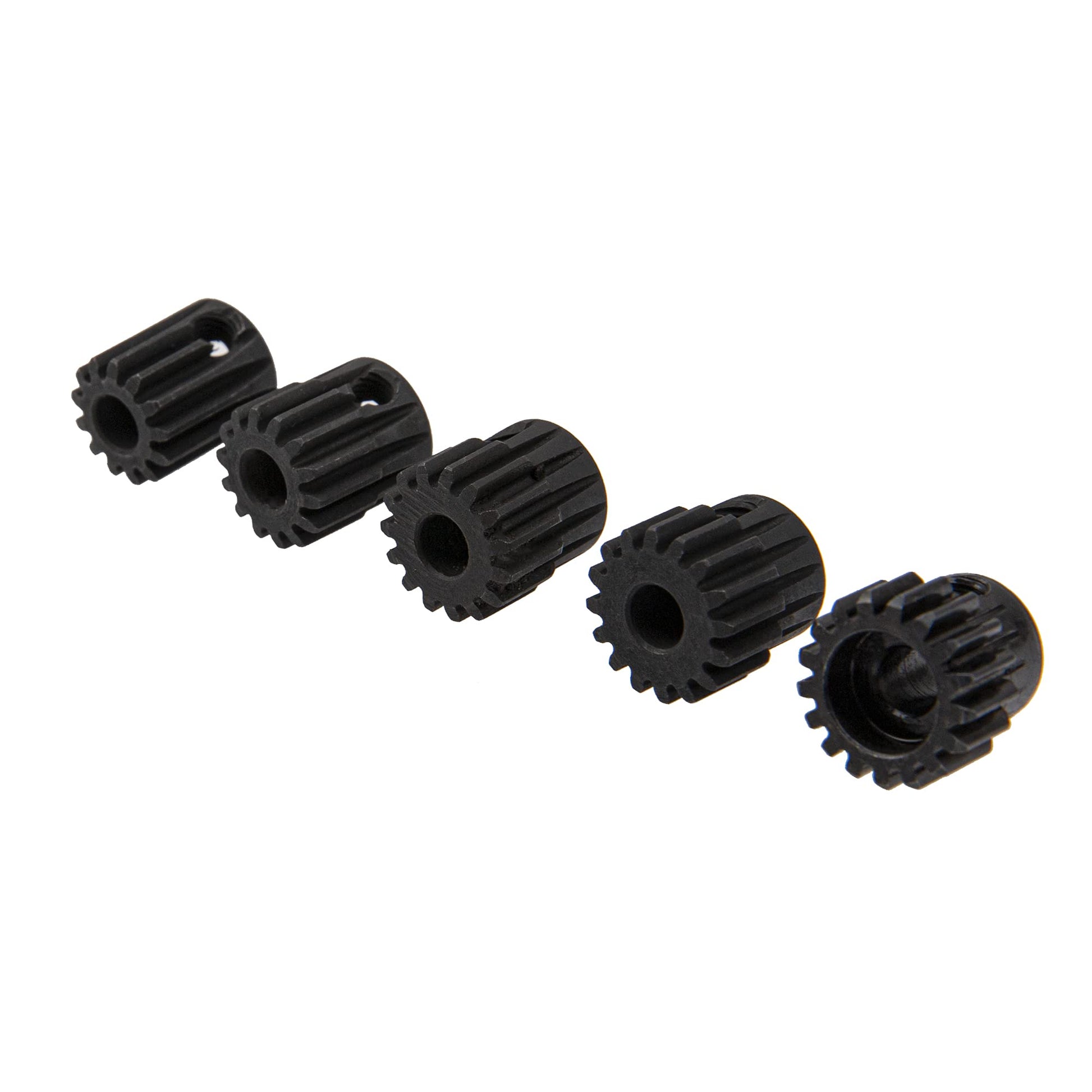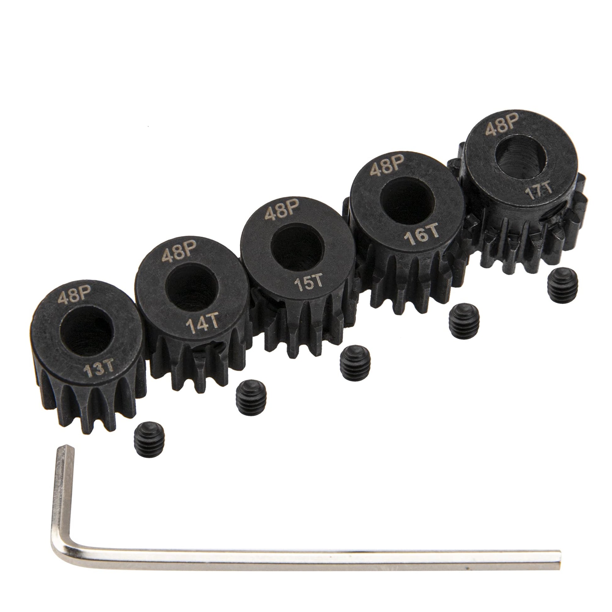 - Q: What are the specifications of the 5Pack ShareGoo Steel Pinion Gear Sets? A: The 5Pack ShareGoo Steel Pinion Gear Sets include 5 different gears with tooth counts of 13T, 14T, 15T, 16T, and 17T. They are designed for a 3.175mm (1/8-inch) shaft and have a tooth pitch of 48. Each gear is made of hardened steel, ensuring durability and reusability.