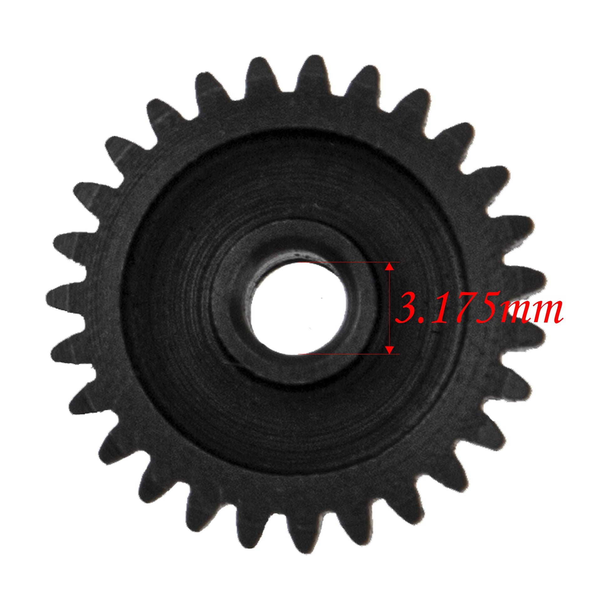 Fit 3.175mm Shaft Size Motors,please make sure the RC motor shaft have the same diameter,Also make sure the spur gear and pinion gear have the same pitch, otherwise the teeth won't mesh. For 3.175mm shaft motor of 1/10 RC Car.Compatible with Arrma HPI Kyosho Losi Axial Traxxas Tamiya Associated 1/10 RC Car Monster Truck Buggy The 48P pinion gear sets are made of hardened steel,durable and reusable. Universal upgrade 48P pinion gear,total 5Pcs,23T 24T 25T 26T 27T with 3.175mm inner diameter. The variety of tooth pinions allows for more gear setups,for different racing track conditions. To avoid the ESC/motor overheat,please check the ESC and motor temperatures regularly throughout the run after change the pinion gear. Easy to install and upgrade.Come with grub screws. Material:Steel Tooth count: 23T 24T 25T 26T 27T Tooth pitch: 48 pitch Height: 9mm For shaft: 3.175mm(1/8-Inch) Package includes: 5x Pinion gear(23T 24T 25T 26T 27T) 5x Grub screws