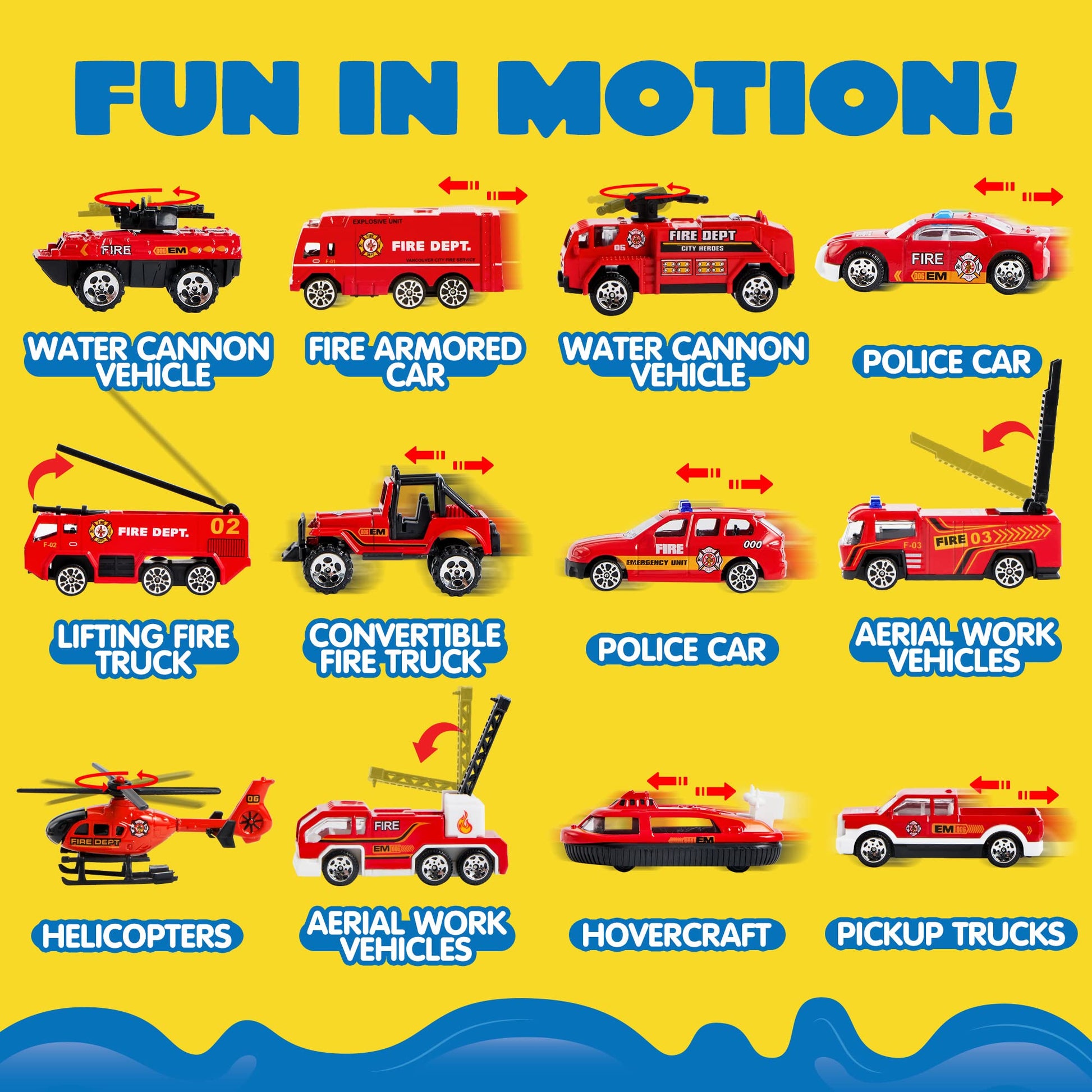 - SUPER VALUE: This set comes with 12 mini fire engine trucks, each with unique designs and functions, all conveniently stored in one carrier truck. The collection features a diverse range of vehicles including a Rescue Helicopter, Fire Ambulance, Fire Engine Vehicles, Lifting Fire Truck, Fire Pickup Truck, Fire Minivan, Fire Tanker, and an Armored Car, along with 12 firefighter figures.