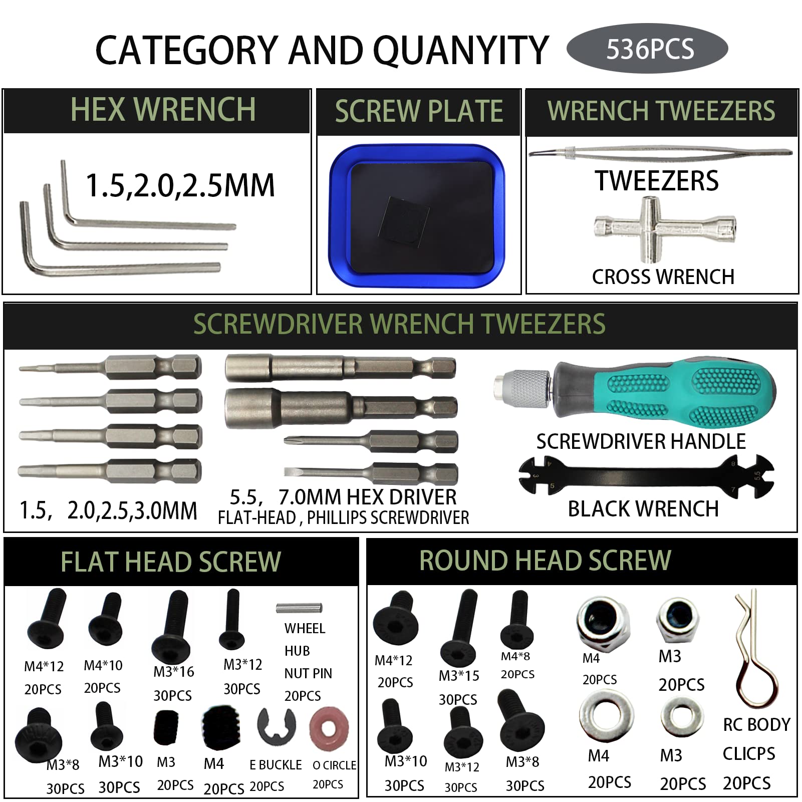 - Q: How many screws and tools are included in the RC repair kit? A: The RC repair kit includes a total of 520 screws of various sizes, a screws pallet, a wrench, a cross wrench, tweezers, and 8 screwdrivers with different head types, including hex and slotted options, to meet all your remote control car maintenance needs.