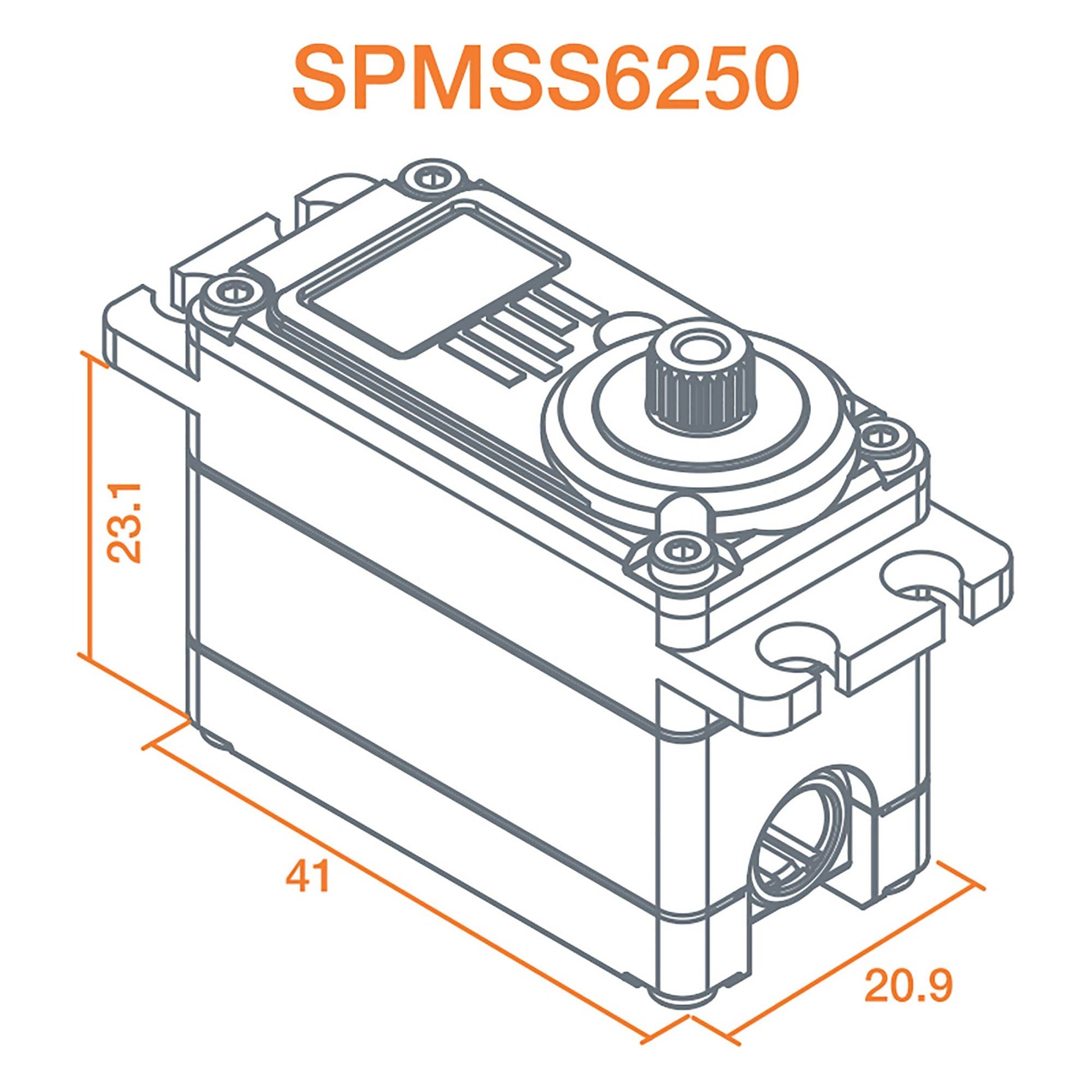 Key Features Removable wire harness with different lengths available 7075 Aluminum hard anodized output shaft/main gear with steel internal gears Aluminum case for good heat dissipation Aluminum mounting tabs NMB dual main bearings 23T output shaft Waterproof 1-Year Limited WarrantyOverviewThe latest generation of Spektrum surface servos provides you with the performance you need for any 1/10th to 1/8th scale vehicle application. The S6230 and S6240 offer high-torque or high-speed performance in a more compact size for 1/10th scale crawlers or monster trucks where space is limited. The S6250 HV and S6260 HV are standard size servos for High-Voltage applications up to 8.4V, And the S6280 HV and S6290 HV feature all metal case construction for the ultimate 1/8th scale performance. All these servos feature Spektrum innovations like the removable wire leads that allow for custom lead length and ease of maintenance and all metal servo mounting tabs to keep them in place through the most extreme conditions.
