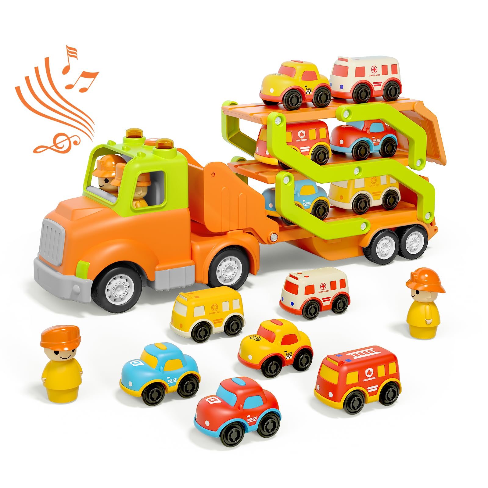 - 7-in-1 Transport Trailer: This truck set includes 1 large transport truck and 6 mini cars. The truck's cab is detachable, and the body can unfold into a 30-inch slide, providing endless fun and versatility for your little one.