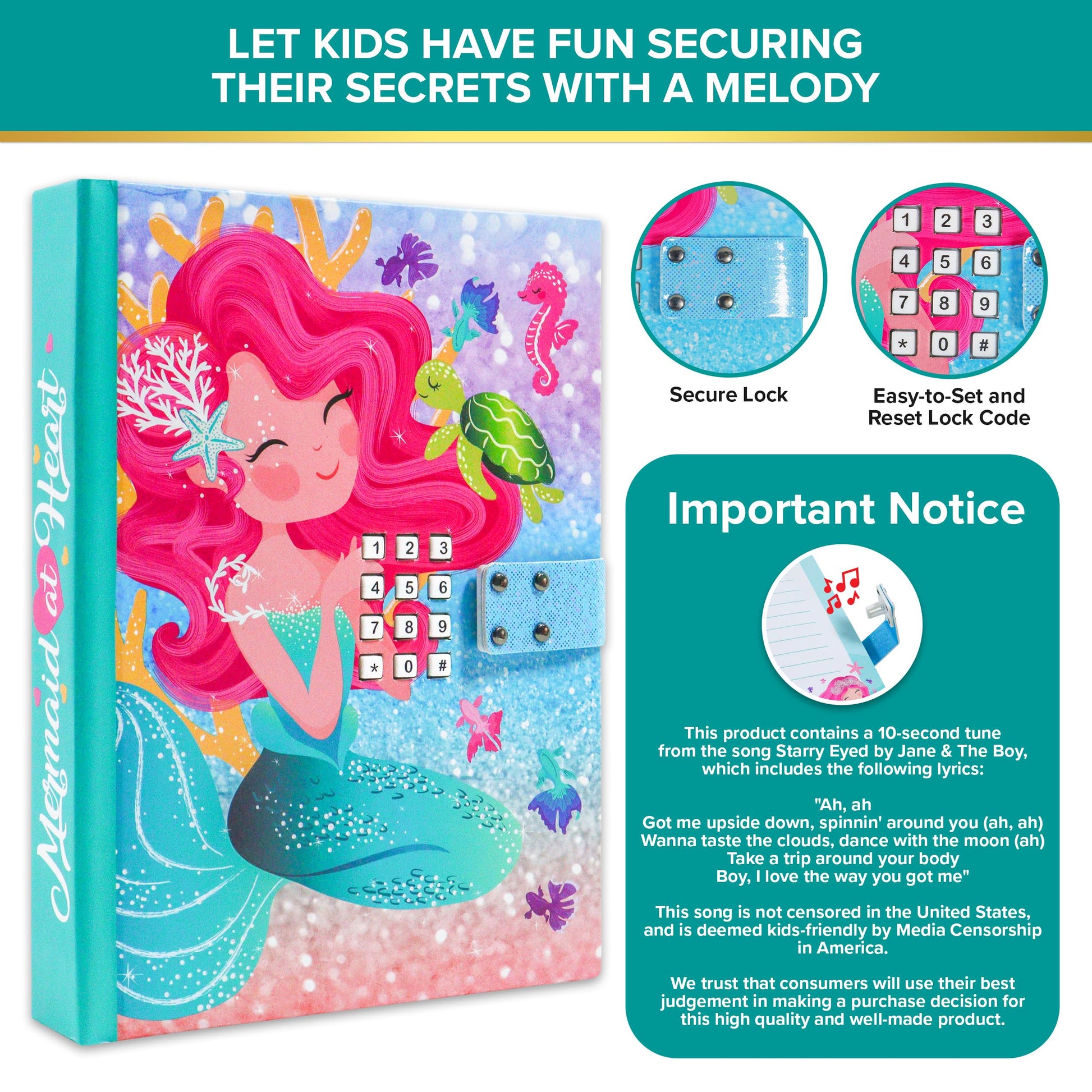 EXPLORE MERMAZING WRITING - With glittery accents and mermaid print design, these 5.9x1.2x7.9in diary with lock for girls are perfect for mermaid lovers to write their adventures. Allow kids to have fun and dive into an ocean of creativity! | FIN-TASTIC SECRET KEEPER WITH MELODY - With the customizable lock code of the girls diary with lock, kids can set their own code to lock secrets! Plus, they can enjoy a 10-second oceanic tune every time they open it, adding fun to journaling. | PLENTY OF SPACE FOR WRITING - Features 160 colorful lined pages, kids can write, draw, & doodle as they like with this high-quality mermaid diary for girls. The durable hard cover keeps everything secure, perfect for all their creative writing. | PERFECT GIFT FOR KIDS - This mermaid girl diary is the perfect gift for any occasion! It even includes a charging cable, so kids can easily keep the music and lock code features ready to add a splash of magic to their journaling adventures. | WE JUST WANNA MAKE YOU SMILE - Your happiness is our unwavering priority. If you ever find yourself less than delighted with your mermaid diarys for kids & mermaid diary code, simply reach out, and it will be made right. The diary book for girls kid journal with lock comes with an instructional sheet to set and reset the lock code easily. Buy with confidence and don't miss out on this well-designed ode diary music & notebook with lock!