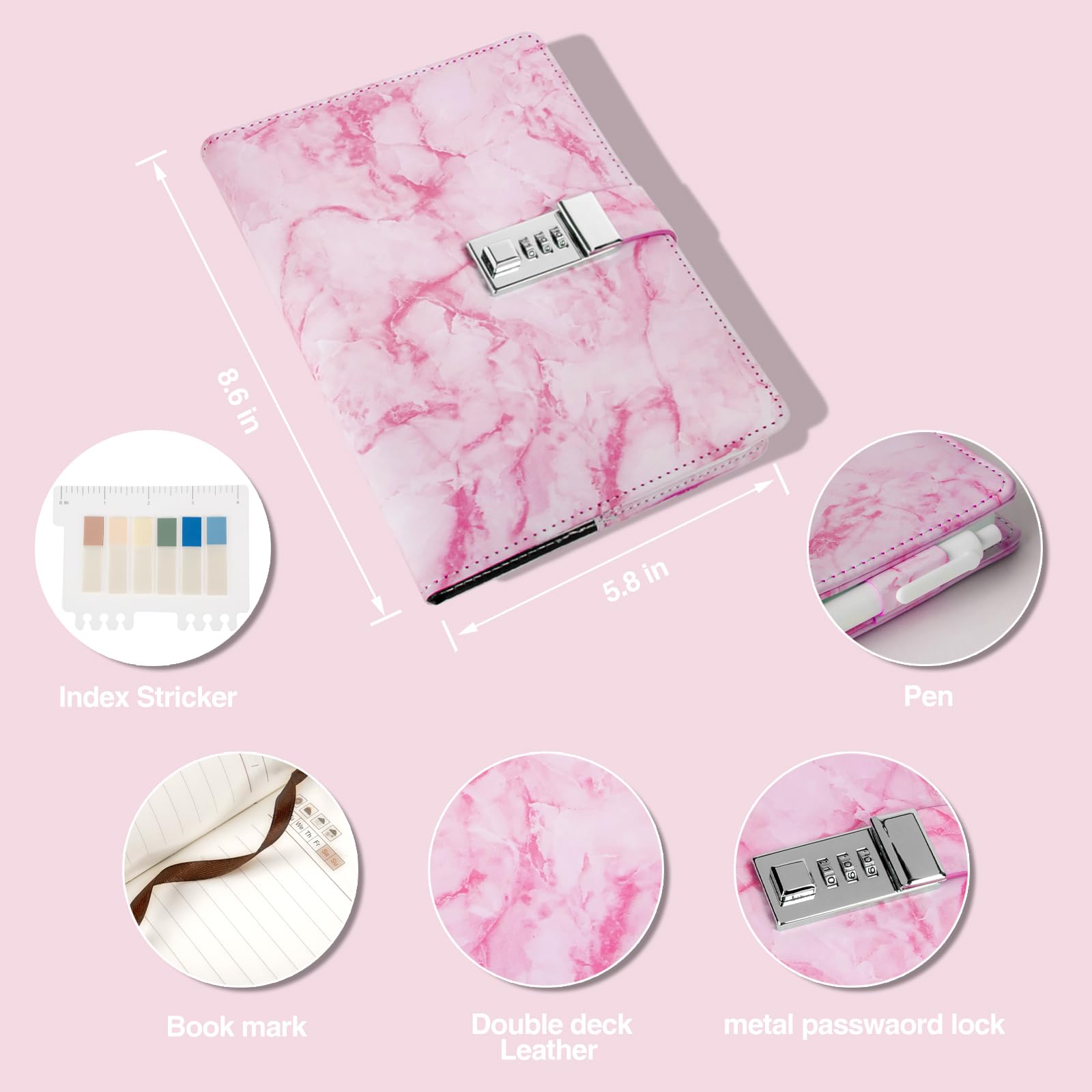 Kutoda Marble Diary with Lock, 192 Pages College Ruled Secret Journal with Lock, Waterproof Diary with Lock, A5 Journal with Lock, Cute Diary Stuff for Teen Girls (Purple & Pink 2pack)