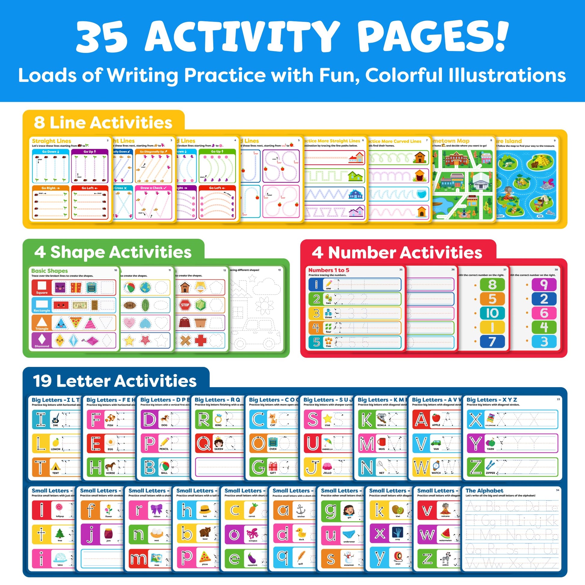 Give Your Little Ones A Headstart With Our Complete Preschool Learning Activities Letter Tracing For Kids Ages 3-5 Set! Learning Resources Homeschool Curriculum Set That Comes With A Fun Letter Tracing For Kids Ages 3-5 Preschool Workbook, 6 Non-Toxic Dry Erase Markers, A Cute Smiley Eraser, An Elastic Pen Holder In A Handy On-The-Go Box. No Need To Purchase Additional Accessories! With 35 Engaging Toddler Learning Activities, Our Kindergarten Workbooks Guide Children Through Lines, Shapes, Letters & Numbers With The Stroke-Based Approach, Grouping Letters By Similar Stroke Patterns To Help Kids Develop Correct Motor Memory. Our Dry Erase Markers Are Safe & Easily Erasable For Repeated Use. Our Books Are Made With Premium Materials – Thick, Sturdy Cardboard, Safe Plastic Spring Binding & A Durable Box With A Handle. This Quiet, Screen-Free Handwriting Practice For Kids Activity Keeps Kids Engaged For Hours, Fostering Initiative & Persistence. The Perfect Gift For Your Child, Nieces, Nephews, And Grandkids!